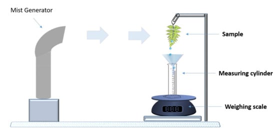 Water collection experiments were performed by exposing the samples with a mist of ultrapure deionized water (18 mΩ) using a cold mist humidifier (Bionaire BU1300W-I, Lachine, QC, Canada) with an air flow of 130 ± 30 mL h−1 and at 15 cm from the sample. Weighing measurements were performed using a weighing scale (KERN, model: 440-43N, Balingen, Germany) with a 0.1 g resolution. The schematic of the experimental setup is shown in Figure 1.