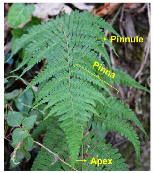 Dryopteris marginata ferns are herbaceous having fronds approximately 20–25 inches long (Figure 2). The blade is 2–3-pinnate, pale green, broadly triangular lanceolate, widely truncated at the base and is about 65 × 25 cm. There are about 15–20 pairs of pinnae, alternate triangular lanceolate, approximately 25 × 6.5 cm in size and fibrillose on the costae. Pinnules are divided up into 15 lobes and alternate, shortly petiolate with an area of approximate 6 × 2.5 cm having an acute apex (Figure 2). There are small scales all over the leaf surfaces. The fern frond has a remarkable ability to channel water rapidly (downwards as well as sideways towards the apex of the pinna and the apex of the main blade which is gravity oriented).