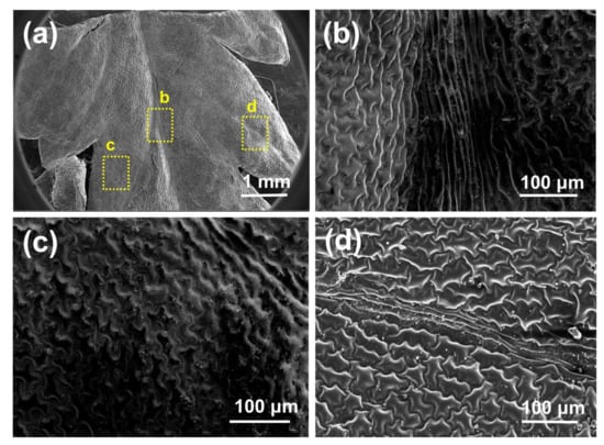 Scanning electron microscopy micrographs of a D. marginata leaf showing (a) the apex part of the pinnule, (b) the main channels, (c) the semicircular grooves and (d) the side channels.