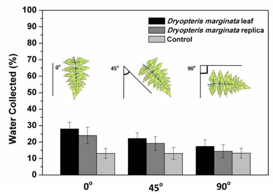 The fog-harvesting and water-channeling experiments were conducted on different samples to show the exceptional water collection behavior of the D. marginata leaf (see Figure 1). A polyethylene sheet, devoid of any surface features, was used as a reference sample for control experiments. Figure 7 shows the results obtained from the fern frond, its replica, and the control sample. The area of the control sample was normalized by calculating the leaf area using a suitable imaging software, such as ImageJ software []. The leaf, the replica and the control samples were exposed to cold water mist at angles 0°, 45° and 90°. The water was collected according to the setup shown in Figure 1 and the efficiency of the channeling was calculated by the amount of cold mist exposed to the samples and the final volume of the water collected. We calculated that the maximum efficiency obtained was approximately 28% when the fern samples were exposed at an angle of 0°. The efficiency decreased when we changed the angles towards the horizontal position and the efficiency was 22% and 17% for the 45° and 90° orientations, respectively. This can be possibly attributed to the orientation of the microchannels towards the apex as demonstrated by SEM analysis.