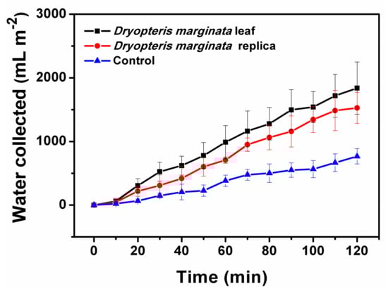 Water-channeling was observed as soon as the surface of the leaf and its replica were wetted by cold mist. To study the water-channeling dynamics, the samples were subjected to the mist for two hours and the amount of water collected was measured. During two hours under mist conditions, the leaf collected 68 ± 8 mL of water. Similarly, the water collected from the leaf replica was 52 ± 9 mL. The water run-off dynamics of both the real and replicated substrates were almost consistent and water collection was almost consistent and at a steady-state with respect to time (Figure 8). The overall amount of water channeled on the real leaf and the replica of D. marginata occurred at a steady rate that fit a linear regression model (R2 = 0.96 and R2 = 0.89, respectively). Compared to previously described fog-harvesting systems, substrates based on the D. marginata leaf showed very good water collection efficiency per unit area and the water was collected at a steady rate, which makes them very good candidates to be utilized in fog-harvesting devices [,,,,,].