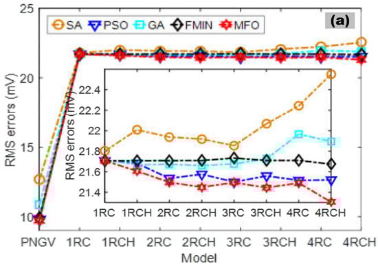 Figure 4a shows the RMSE of model error in the entire SOC area. It can be seen that the PNGV had a great accuracy advantage. For the nRC model, the model accuracy of the MFO increased with the increase of n, and the accuracy of the other optimization algorithms did not increase or even decrease when the order was greater than the second. Moreover, MFO had an obvious accuracy advantage for the high-order RC model. The model error distribution in the low SOC area (0–20%) is shown in Figure 4b, indicated that the PNGV model had obvious advantages in the low SOC area, and the FMIN, PSO, and MFO had almost the same identification accuracy. The error distribution comparison between the PNGV model and the 2RC model in the low SOC area is shown in Figure 5. It is clear that the PNGV model had a good accuracy in the low SOC area. The error distribution in the high SOC area (20–100%) is shown in Figure 4c. It can be seen that the second- and higher-order RC models had high accuracy using PSO and MFO, and the accuracy of MFO was slightly higher. The identification time of each identification algorithm is shown in Figure 6. It can be seen that the FMIN had the shortest identification time, and PSO had the second shortest identification time (approximately one-sixth of the time taken by the other algorithms). Therefore, these two algorithms are suitable for on-line identification.