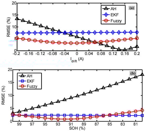 Figure 15a depicts the relationship between the RMSE of SOC estimation and the error of the current sensor. We can see that the fuzzy fusion algorithm was better than others in considering the sensor error. Figure 15b shows the relationship between the RMSE of SOC estimation and the SOH. It is clear that the SOC estimation accuracy of the fuzzy fusion algorithm exceeded that of the EKF when the SOH fell from 100% to 80%. Thus, it is deduced that the Comb algorithm is highly adaptable to the capacity decay of an LIB. Figure 15c shows the RMSE of SOC estimation for values of −100 to 100 mV. We can see that the fuzzy fusion algorithm was better than the EKF when model and sensor errors were considered. When the current sensor error existed, the SOC obtained by the AH had a larger cumulative error. Therefore, our proposed method was better than that of the EKF and AH in cases D, E, and F.