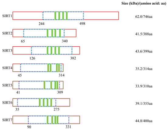 Schematic representation of human sirtuins. Sirtuins require NAD+ as a cofactor to exert their function with NAD+ dependent catalytic domain (dotted: blue) and zinc-binding domain (closed: green).