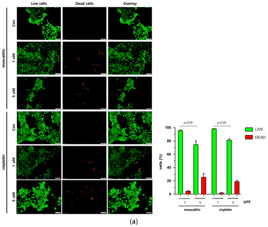 To visualize the live and dead FaDu cells, the LIVE/DEAD® Viability/Cytotoxicity Kit (Thermo Scientific, Rockford, IL, USA) was used according to the manufacturer’s protocol. The FaDu cells were seeded into 35-mm confocal dishes at a density of 0.2 × 105 cells/mL and incubated at 37 °C for 24 h. After incubation, the cultured FaDu cells were treated with the indicated concentrations of moscatilin or cisplatin (0, 1, and 5 μM) for 48 h. Thereafter, 5 μL of calcein-AM and 20 μL of ethidium homodimer-1 reagent were added into cultured FaDu cells, and the cells were incubated for a further 0.5 h. The stained cells were analyzed by confocal microscopy.