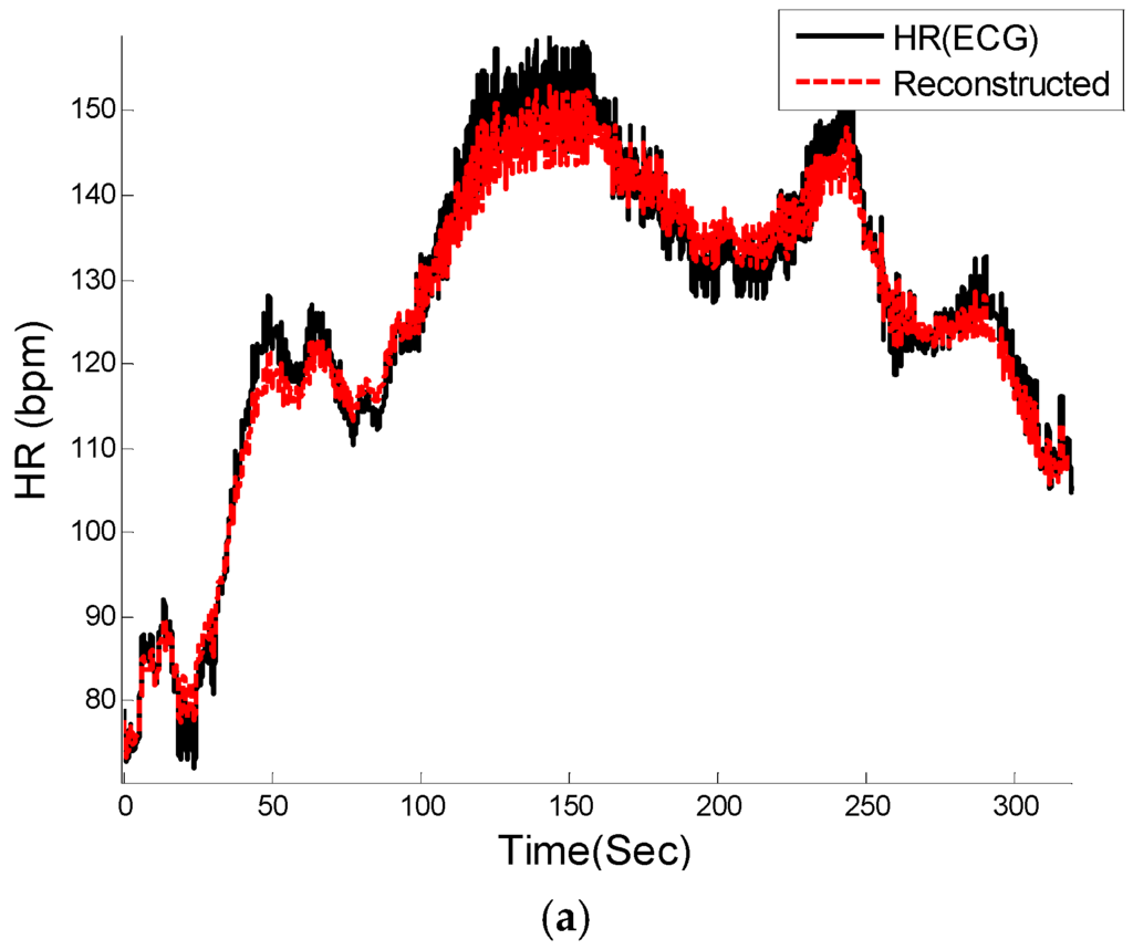 Reconstructed HR vs. reference HR: (a) Subject 14 (IEEE Competition Test Dataset); (b) Subject 16 (IEEE Competition Test Dataset).