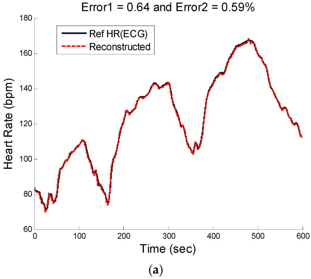 Figure 9a illustrates the comparison between the reconstructed HR and the reference HR for subject #14 which has the highest errors. Subject #14 belongs to the second dataset (IEEE Competition Test dataset) and Type 2 activities (e.g., jumping). It can be seen that the largest error is obtained when both the physiological HR and the motion artifacts change rapidly so that the true HR cannot be reliably estimated. Figure 9b shows the comparison results of reconstructed HR and reference HR for recording #16 of the second dataset (IEEE Competition Test dataset) which has the Type 3 activities (e.g., arm exercise).The results for recording #30 from the third datasets (Chon Lab datasets) and activity Type 4 (e.g., running on treadmill) are shown in Figure 10. It can be seen that the E1 for this subject is around 0.6 bpm and the correlation between the PSD of reconstructed HR and reference HR is as high as 99% for LF and 0.96 for HF frequency range. All subjects’ results are provided in Table 4.