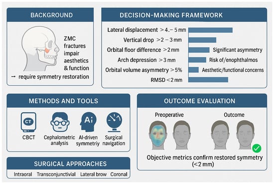 Zygomaticomaxillary complex (ZMC) fractures are among the most common midfacial injuries, with significant implications for both function and facial esthetics. Optimal management requires restoring the normal anatomical alignment and symmetry of the zygomatic region to prevent long-term deformity and functional deficits. However, the decision-making surrounding surgical intervention, particularly in isolated ZMC fractures with moderate displacement, remains nuanced. This review discusses contemporary surgical approaches for isolated ZMC fractures and examines how objective morphometric analysis can guide critical decisions such as the timing of surgery, choice of surgical approach, and extent of fixation. Conventional assessment tools like computed tomography (CT), cephalometric measurements, and intraoperative imaging provide foundational data on fracture anatomy. Emerging technologies, including three-dimensional (3D) photogrammetry, stereophotogrammetry, artificial intelligence (AI)-based symmetry analysis, and surgical navigation systems, offer advanced means to quantify facial symmetry and bone alignment. By integrating these objective metrics into clinical practice, surgeons can enhance preoperative planning and postoperative outcome evaluation, with a particular focus on achieving facial symmetry for optimal esthetic and functional results. We also outline clinical decision-making frameworks that incorporate quantitative measurements, and we discuss current limitations, future directions, and the potential for standardizing protocols in the management of ZMC fractures. Full article