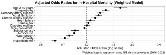 Background/Objectives: Intracerebral hemorrhage (ICH) is primarily a disease of older adults, commonly linked to chronic hypertension and cerebral amyloid angiopathy. In young adults, however, ICH is rare and often driven by distinct structural, hematologic, or vascular causes. Methods: Using the National Inpatient Sample (2016–2022), we identified hospitalizations with a primary diagnosis of ICH (ICD-10-CM: I61.x). Patients younger than 18 years were excluded. Patients were stratified into 18–39 vs. ≥40 years. Comorbidities were defined using validated ICD-10 codes (E08–E13 for diabetes mellitus, I10–I15 for hypertension), excluding transient hyperglycemia (R73.x). Weighted analyses using NIS discharge weights compared demographics, comorbidities, rare etiologies, and outcomes, including in-hospital mortality, length of stay (LOS), and total hospital charges. Survey-weighted multivariable logistic regression identified independent predictors of mortality. Results: Among 76,264 ICH hospitalizations, 4012 (5.3%) occurred in patients < 40 years. Compared with older adults, younger patients had lower prevalence of hypertension (47.8% vs. 84.1%) and diabetes (10.2% vs. 60.4%) but higher rates of substance use (27.7% vs. 15.6%). Rare etiologies were more frequent, including arteriovenous malformation/aneurysm (14.0% vs. 3.6%), Moyamoya disease (1.4% vs. 0.2%), sickle cell disease (1.1% vs. 0.1%), and pregnancy-related ICH (0.05%). In-hospital mortality was lower among young adults (15.7% vs. 21.7%, p < 0.001), though LOS was longer (12.1 vs. 8.7 days, p < 0.001), and mean hospital charges were higher ($228,000 vs. $125,000, p < 0.001). Conclusions: Young-adult ICH is uncommon but etiologically distinct, often associated with vascular malformations, hemoglobinopathies, and substance use. Despite lower mortality, these patients experience longer and more resource-intensive hospitalizations, underscoring a substantial clinical and economic burden. Full article