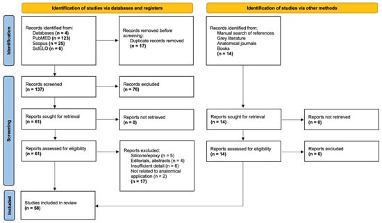 Background/Objectives: Plastination with polyester resin is a consolidated technique for anatomical preservation, particularly valuable in neuroanatomy education and radiological correlation. This review synthesizes the principles, technical evolution, methodological variations, applications, and limitations of polyester-based sheet plastination methods (P35, P40, P45). Methods: Key documents [...] Read more.