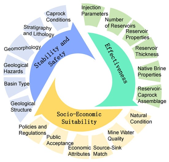 Deep well injection and storage (DWIS) technology provides an effective alternative to address the high cost, energy intensity, and limited scalability of conventional treatments for high-salinity mine water from coal mines. However, the absence of a dedicated site suitability evaluation framework remains a major gap. Unlike previous approaches that directly applied CO2 storage criteria, this study refines and restructures the framework based on a systematic analysis of the fundamental differences in mechanisms and risk characteristics unique to mine water storage. Building on the experience of CO2 geological storage assessment, this study analyzes the key differences in fluid properties and storage mechanisms between water and CO2 and, for the first time, establishes a comprehensive site suitability evaluation framework for mine water geological storage. The framework integrates three main dimensions—stability and safety, effectiveness, and socio-economic factors—covering 80 key parameters. The indicator system is organized hierarchically at the basin, target-area, and site levels, and incorporates a multi-scale weight adaptation mechanism that assigns scale-dependent weights to the most influential indicators at each evaluation level. An innovative evaluation methodology combining a “one-vote veto” mechanism, progressive filtering, and multi-factor weighted superposition is proposed to determine storage suitability. This work fills a critical research gap in systematic site selection for deep mine water storage in China. It offers theoretical guidance and an engineering paradigm for overcoming technological bottlenecks in high-salinity water treatment, enabling efficient and low-carbon disposal. The study has important implications for promoting the green transformation of the mining industry and achieving national carbon peaking and neutrality goals. Full article