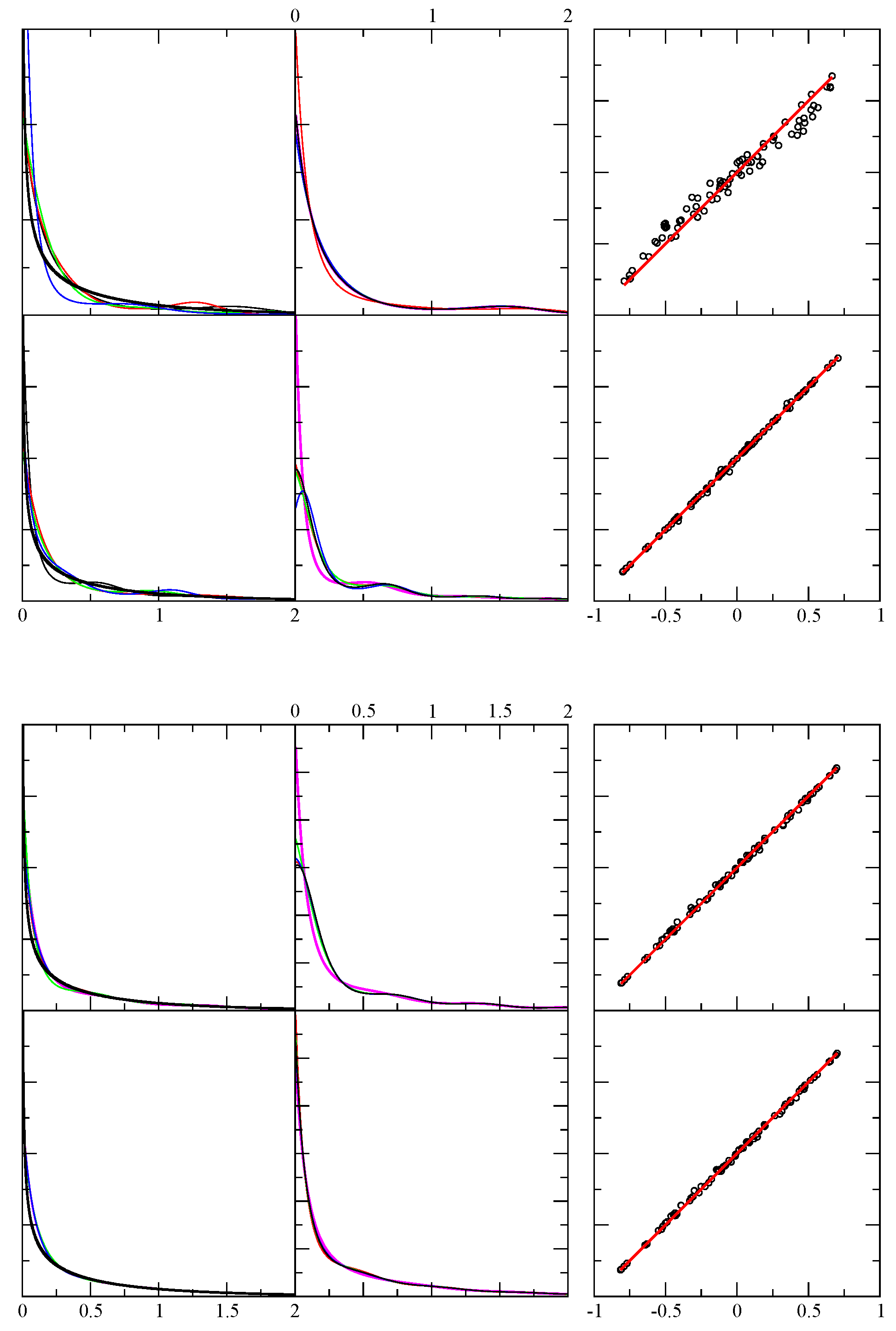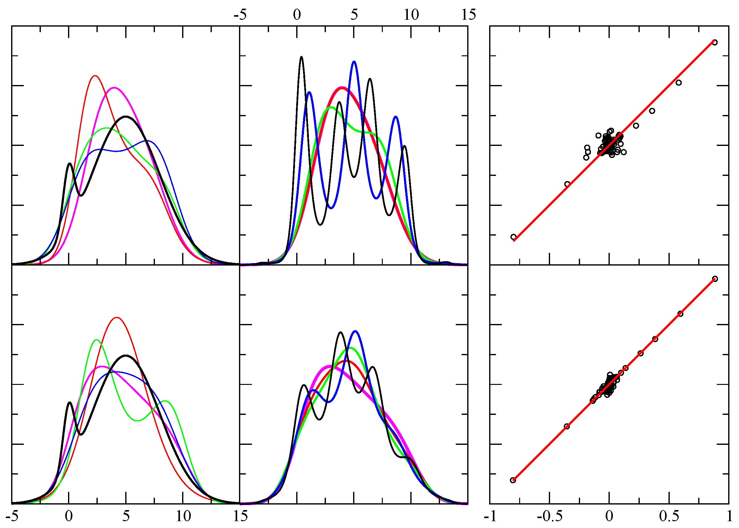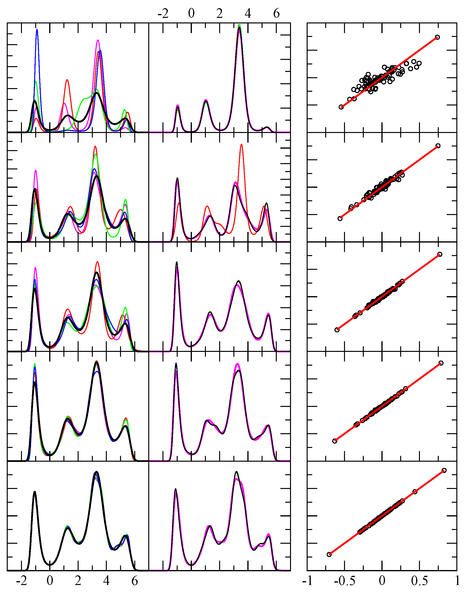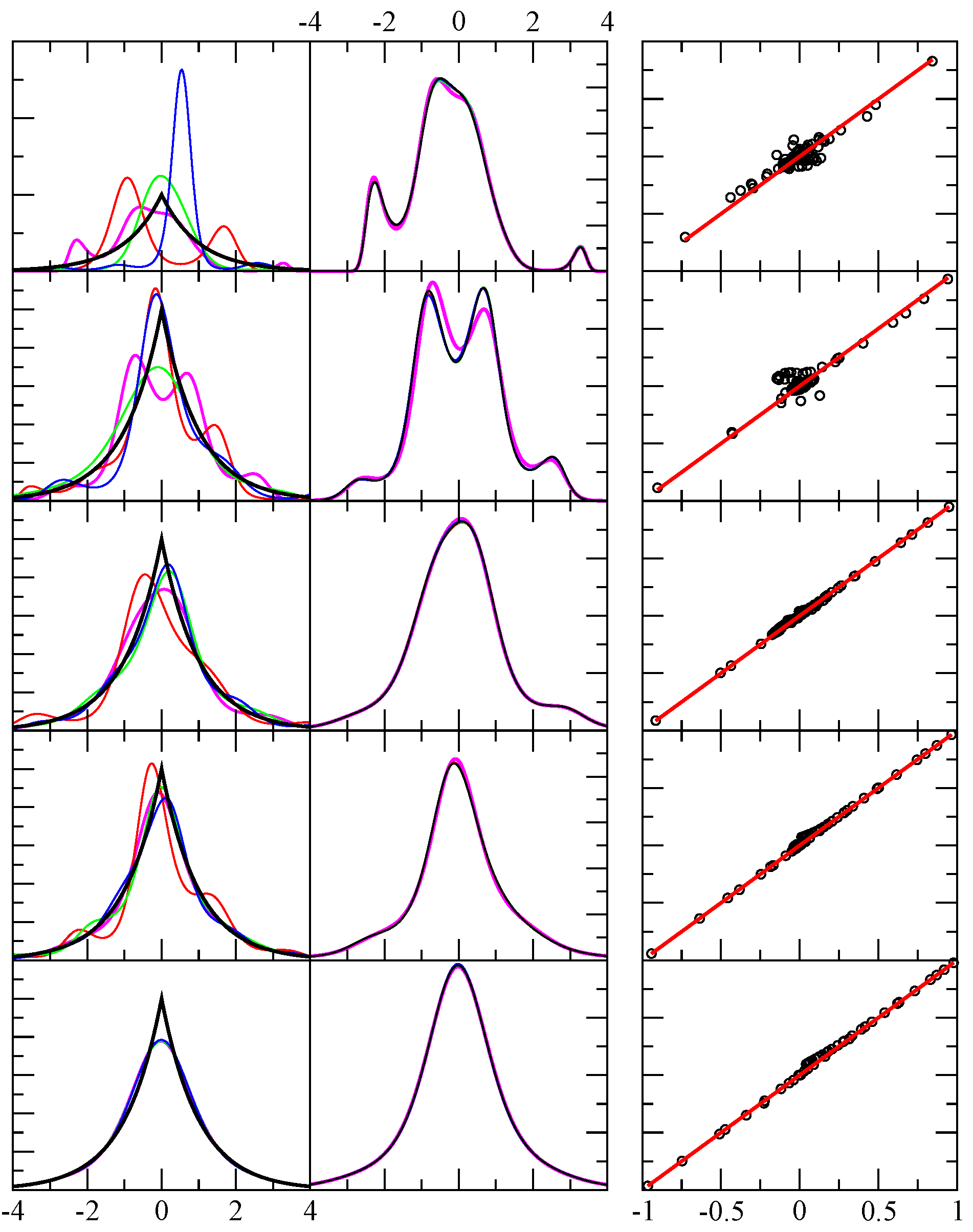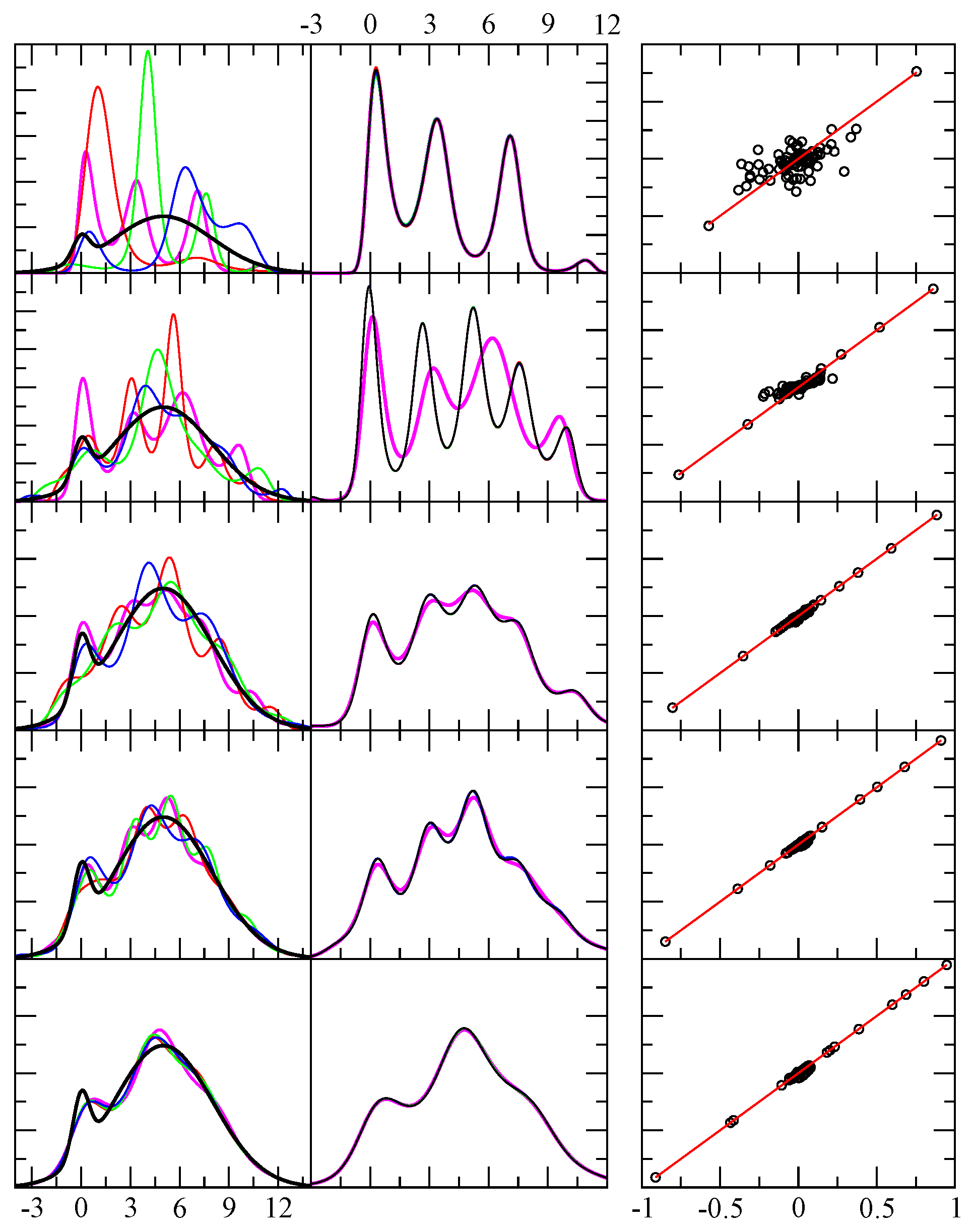 Example results for test case 4. The first column shows the exact pdf (black) and four predicted pdf (red, green, blue, magenta) using independent random samples. The x-axis displays the range of the random variable in arbitrary units, while the y-axis is dimensionless. From top to bottom rows the number of random events in each sample were 64, 256, 1024, 4096 and 1048576. The second column is similar to the first, except it shows the result shown in magenta in the first column, and compares it with four additional results for the same sample — but from a different funnel diffusion run (black, red, green and blue). The third column shows 80 different level function moments calculated from the empirical data (x-axis) and from the theoretical prediction (y-axis) as defined in Equation 5. Perfect agreement would fall along the red line ().