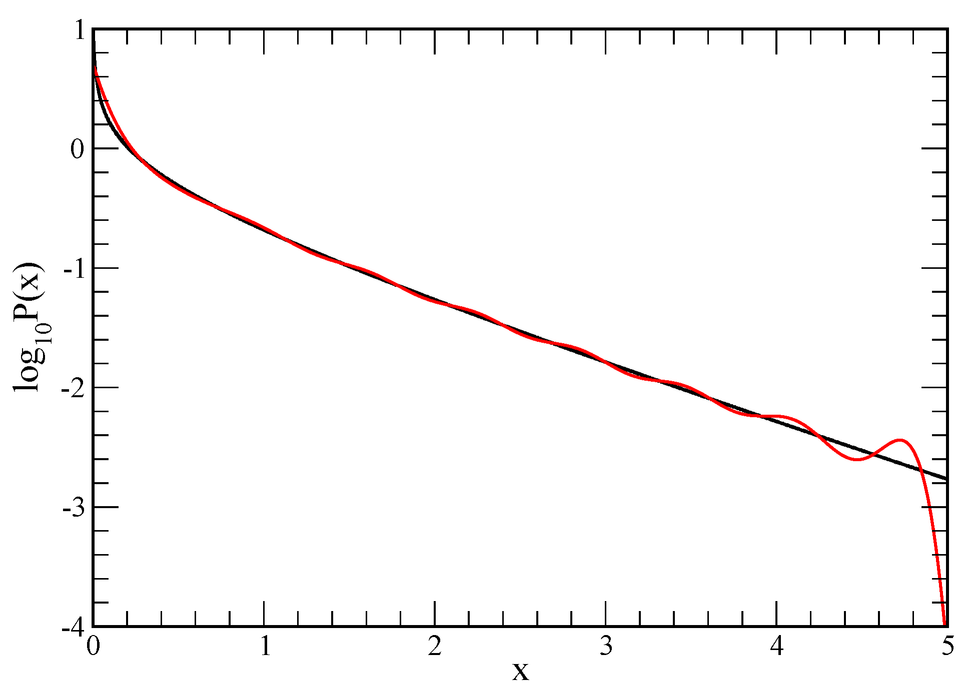 For the largest random data set consisting of samples, the predicted matches extremely well to the exact result. To show the level of deviation, the same data is plotted in Figure 4 on a log scale for the probability. It is seen that the predicted on the far tail starts to fall off much faster than the true , which is mainly due to the Jacobian factor in transforming back from to . In this large sample case, the number of terms used is between 23 and 26. An important aspect of this method, is that for 1024 samples, there already emerges a very good representative of the true pdf.