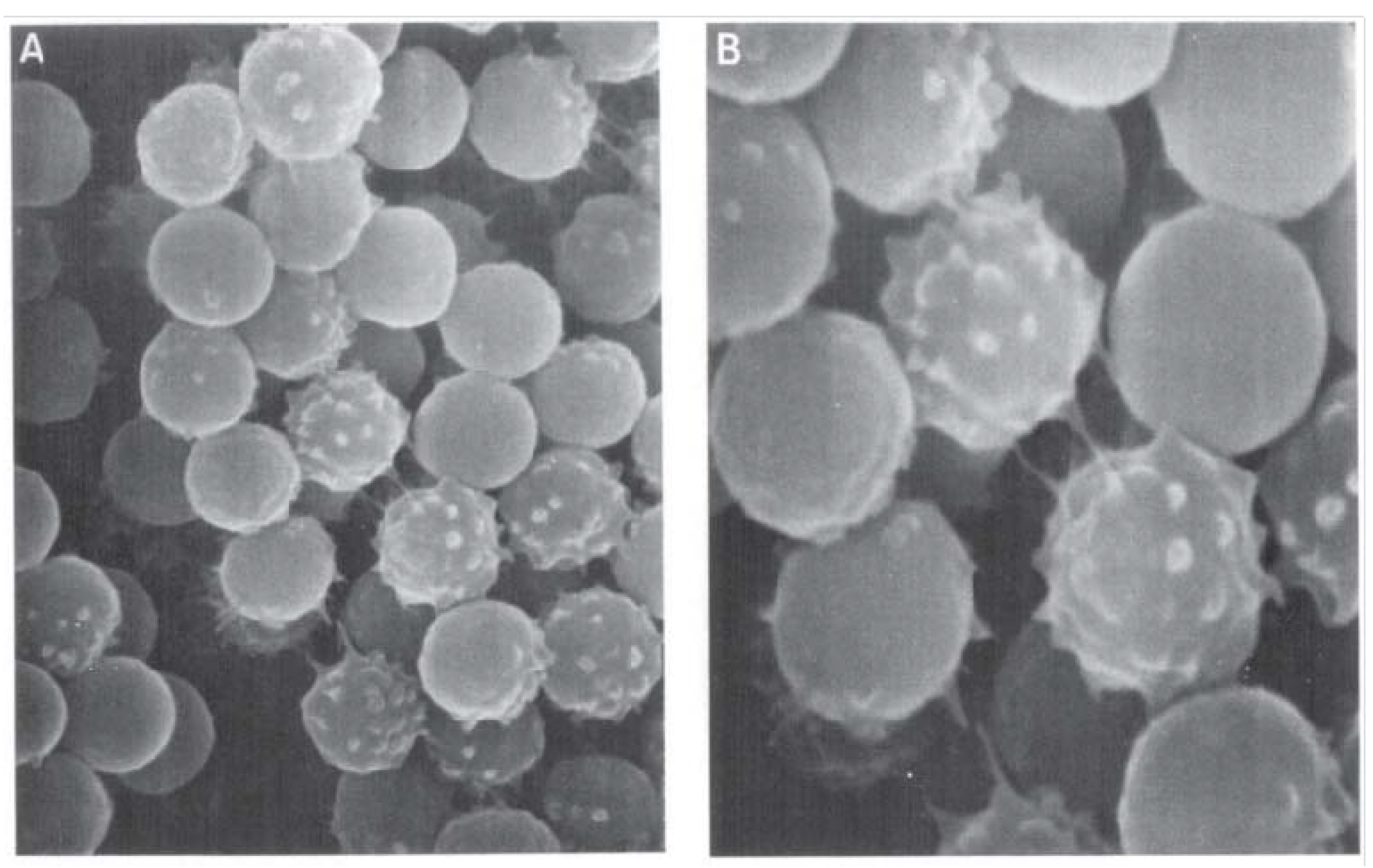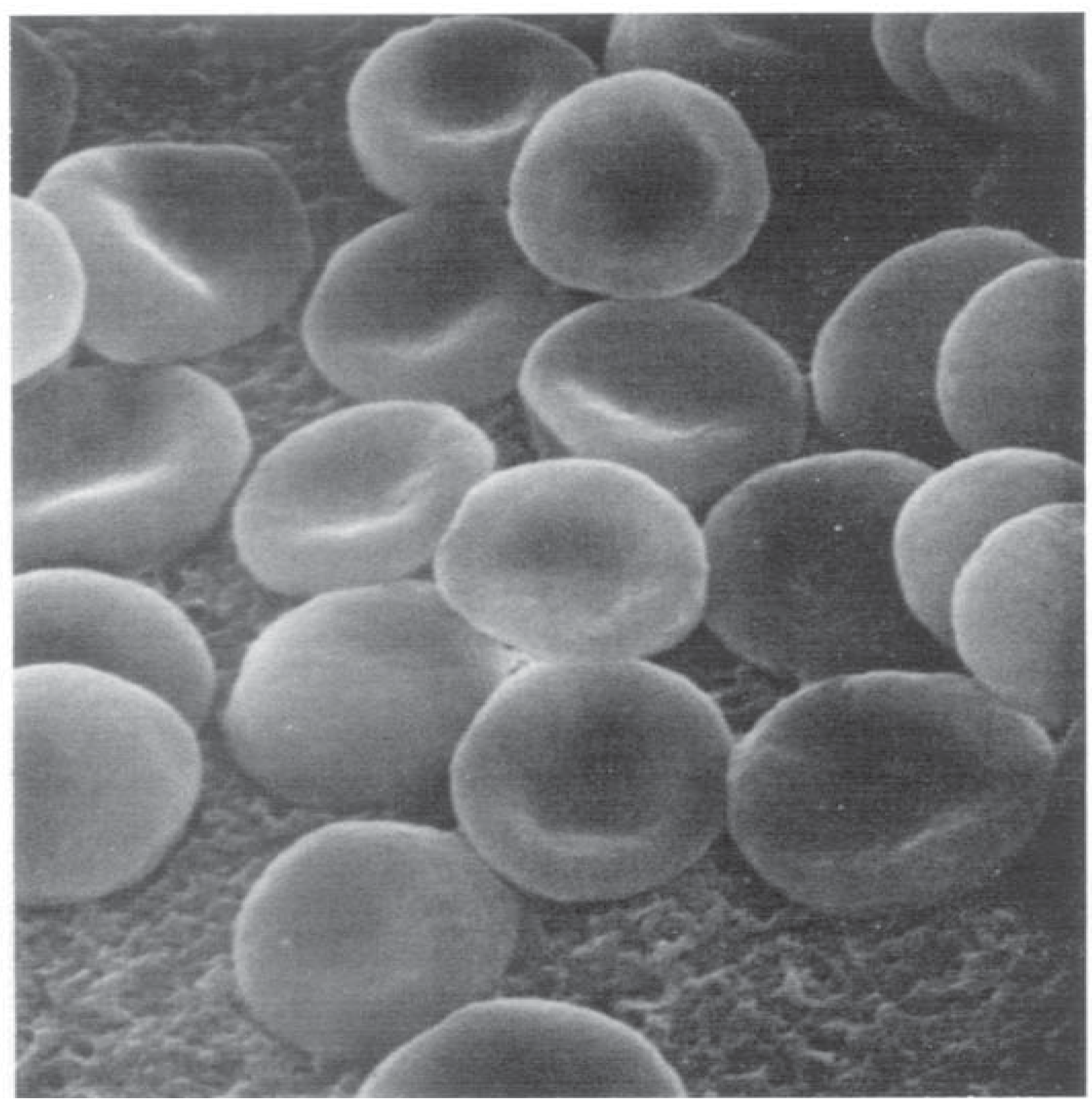 (a) Scanning electron micrograph of human erythrocytes in hypotonic saline solution. ×10,000; (b) Scanning electron micrograph of human erythrocytes in hypotonic saline solution. ×20,000. Scans were originally published by Bleau et al. [271] and are republished here with permission of the publisher.