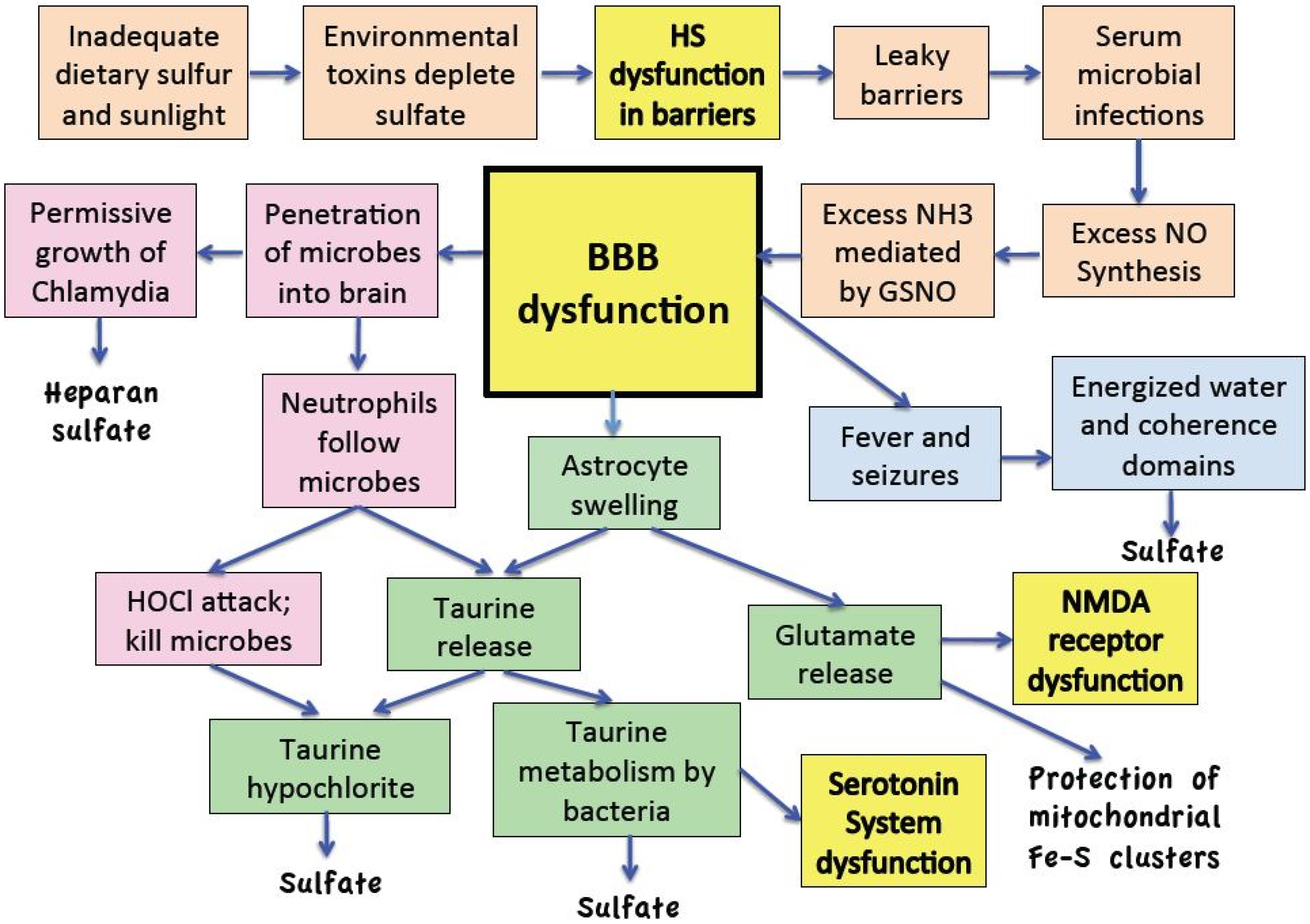 The section below provides evidence of impaired sulfur metabolism and excess nitric oxide production in ASD and shows that excess ammonia synthesis is a key sensitizing factor for encephalitis. Then, Section 3 shows that heparan sulfate, particularly in the lysosome, enables the killing and breakdown of invasive pathogens. Section 4 draws analogies between ASD and hepatic encephalopathy. Section 5 points out the significance of glutamate in the brain, both as a key neurotransmitter and as a metabolite for the renewal of ATP during impaired glucose uptake. Astrocytes respond to swelling by releasing taurine, glutamate, glutamine and aspartate, which can supply neurons with alternative fuel to protect them from mitochondrial complex I damage during an immune assault. Section 6 shows that the sulfonic amino acid, taurine, enables detoxifying of hypochlorite, a key weapon used by neutrophils in their attack on invasive pathogens. This section also describes how taurine chloramine, the product of the reaction of taurine with hypochlorite, can plausibly be metabolized to resupply sulfate. Section 7 develops the idea that seizures and high fever provide the necessary energy to fuel the synthesis of cholesterol sulfate by RBCs, endothelial cells, platelets, and neurons. Section 8 discusses environmental factors known, or plausibly believed, to be synergistically involved in ammonia exposure and/or encephalopathies. Section 9 shows how impairments in immune response and serotonin function associated with ASD may represent a method for replenishing depleted cellular sulfate supplies. Section 10, then, presents the hypothesized signaling cascade invoked whenever the blood stream reaches dangerous instability due to depletion of sulfate and/or over-production of nitric oxide. Following a discussion section, we conclude with a brief summary of our findings.
