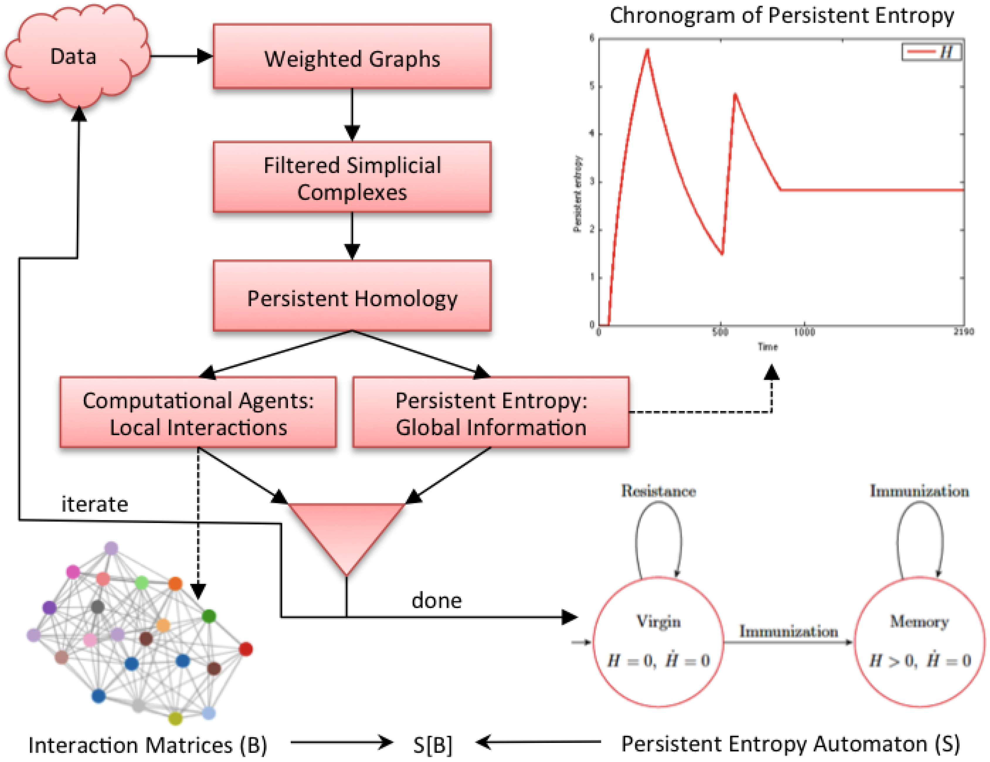 Figure 2 graphically shows our methodology. It is an iterative process where each iteration corresponds to the analysis of a data sample (observation) of the complex system under study. In each iteration, data are first converted into a weighted graph in order to apply the subsequent steps. The graph is taken as the scaffold of the topological space from which the representation with a filtered simplicial complex is derived. Then, persistent homology is computed in order to calculate the topological invariants of the underlying topological space and to identify their generators. At this point, two kinds of information are derived: the computational agents (from the generators) that give rise to the behavioral level B of and the persistent entropy (from the invariants) that is a newly-introduced entropic measure describing the global dynamics of the complex system.