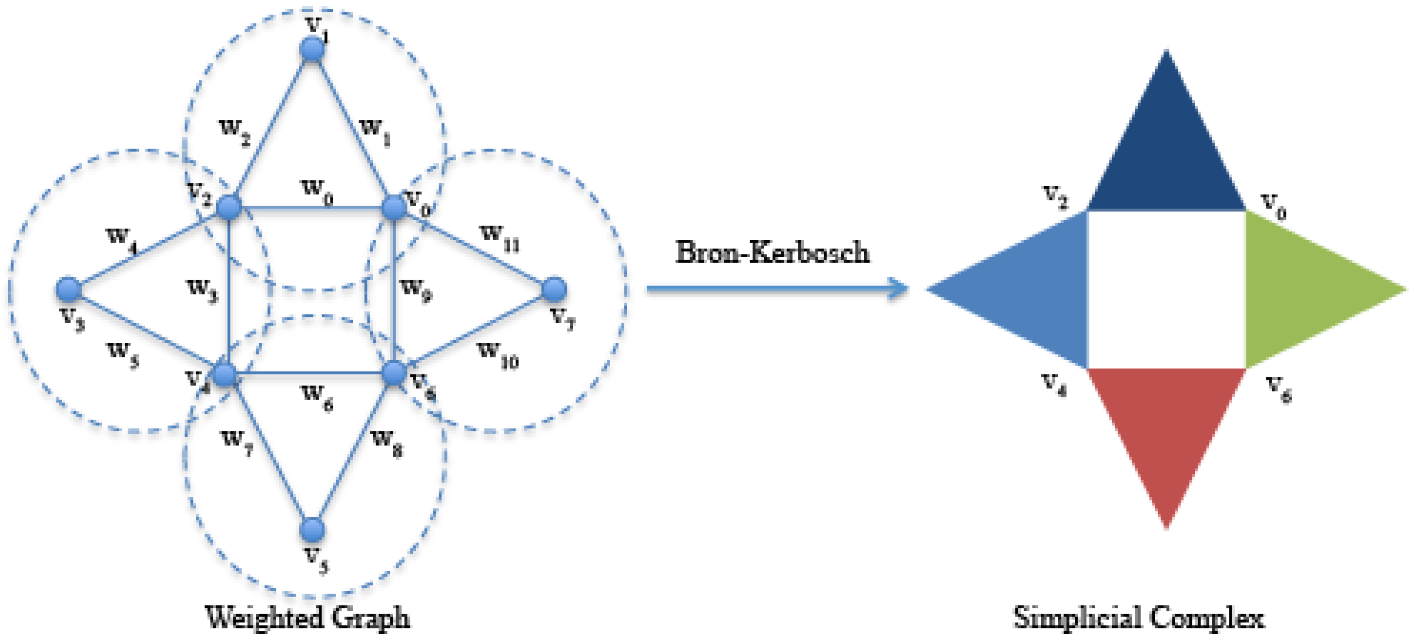 Given a directed or undirected graph, it is possible to construct from it a simplicial complex following several approaches [19]. In this work, we use the clique complexes; given a graph , a clique is a complete subgraph, and a maximal clique is a clique that is not contained in a larger clique. We use the Bron–Kerbosch algorithm [20] for listing all of the maximal cliques of a graph. As shown in Figure 3, a simplicial clique complex of G is the simplicial complex whose simplices are all of the maximal cliques of G. Since a k-clique is equivalent to a -simplicial complex, then a 3-clique is equivalent to a 2-simplicial complex, and so on [21].