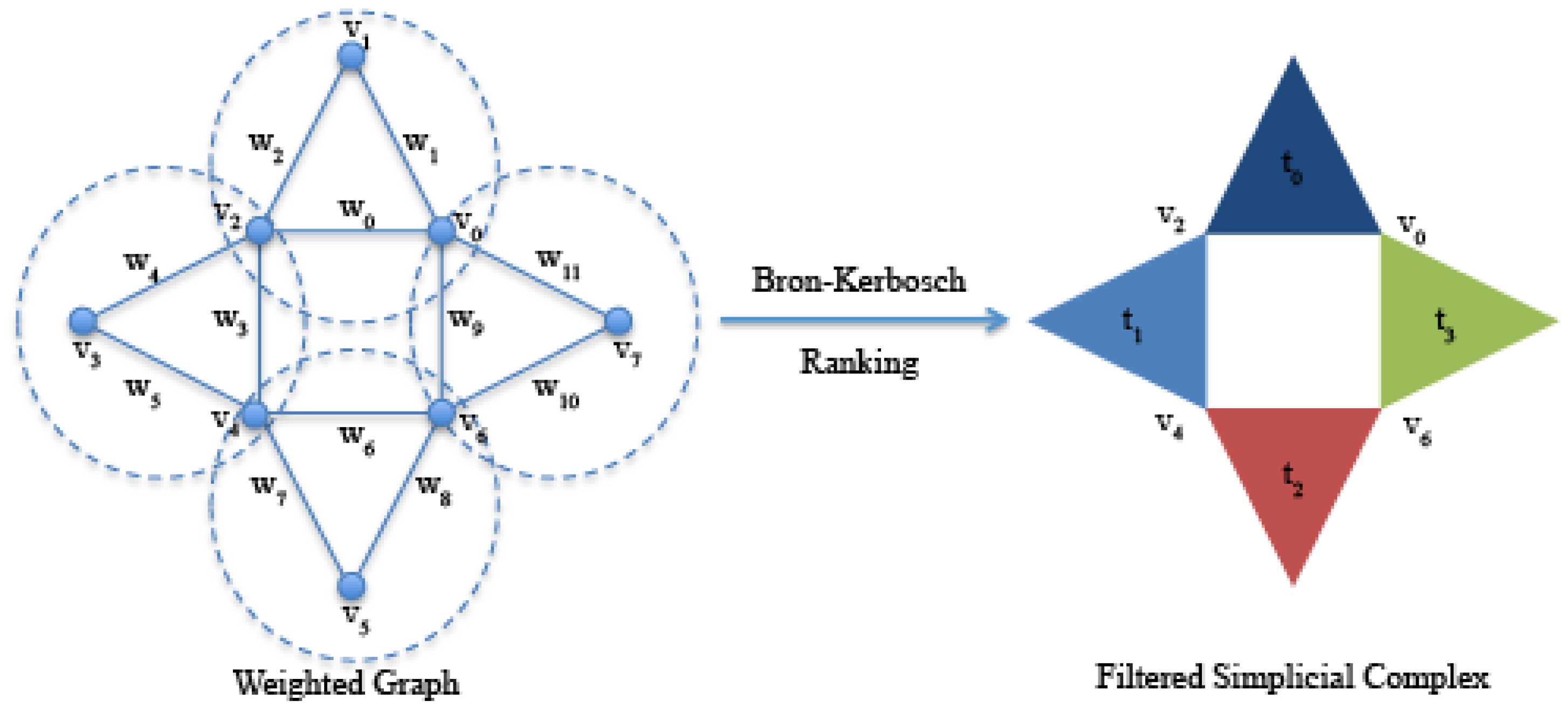 On the left, an undirected graph formed by eight vertices and twelve edges with weights with . Highlighted by dashed circles, the four 3-maximal cliques , , and identified by the Bron–Kerbosch algorithm. On the right, the simplicial complex formed by the four 2-simplices (filled triangles) corresponding to the four 3-maximal cliques.