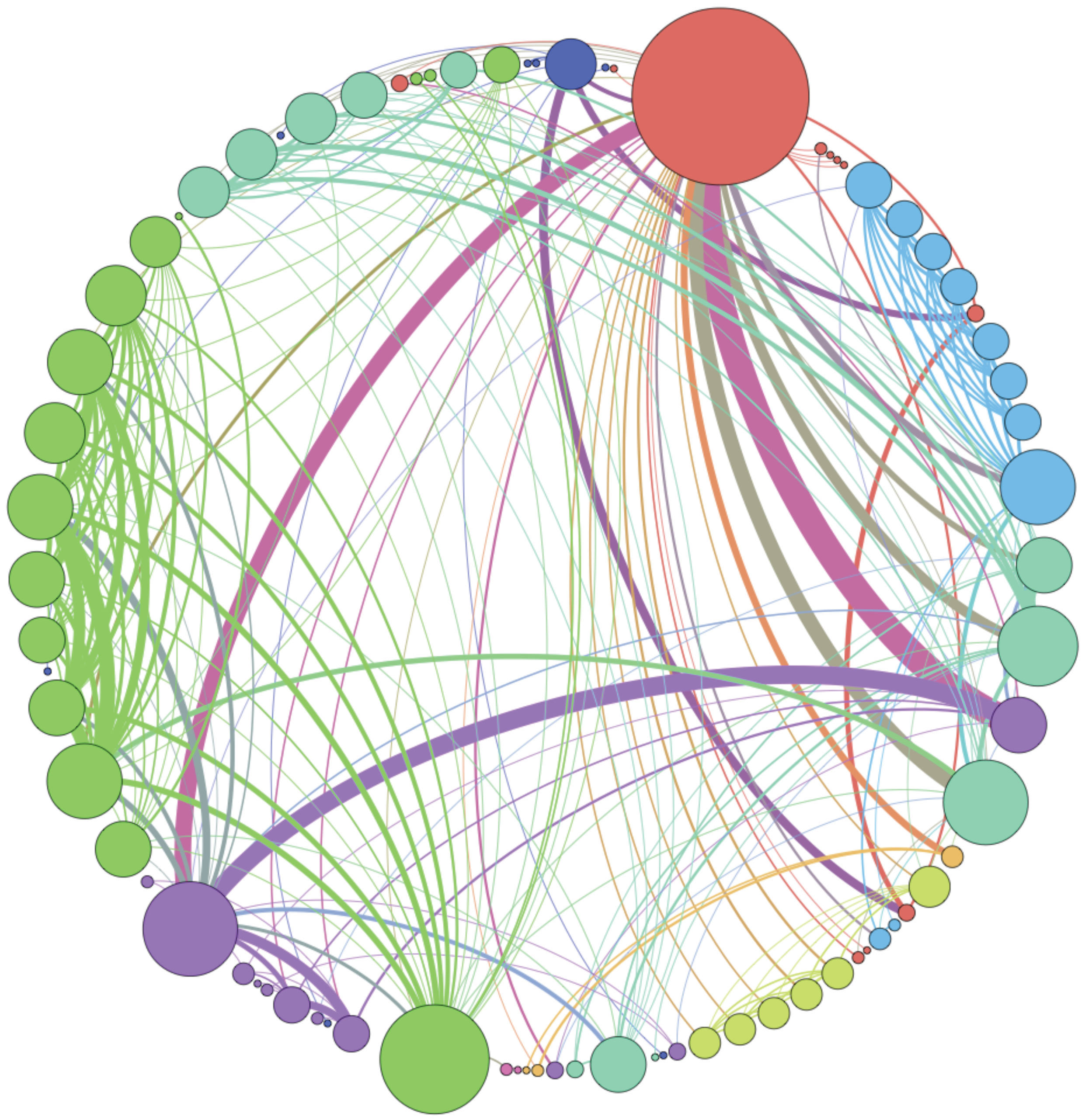 Example of the immune network at the end of a simulation. The thickness of the arcs is proportional to their weight; the diameter of the nodes is proportional to the number of incident edges.