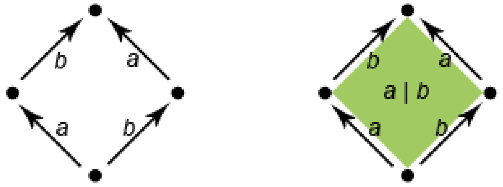 Figure 7 shows how to pass from a classical automaton to an HDA with a two-dimensional object, a surface. In the classical automaton on the left, the state at the bottom has two outgoing edges labeled a and b followed by b and a, respectively. Using an interleaving semantics, the automaton can perform both the two sequences of transitions labeled and . However, geometrically, the graph representing the automaton contains a hole, that is the interior of the square. Pratt suggested replacing the interleaving semantics with true concurrency by filling the hole (see Figure 7, right). The surface, depicted on the right, represents the simultaneous execution of a and b without imposing any order. Conversely, the “sculpting” of the inner surface by proper transformations allows one to represent with HDAs, also classical non-determinism, i.e., the presence of both possibilities of performing first a and then b or performing first b and then a.
