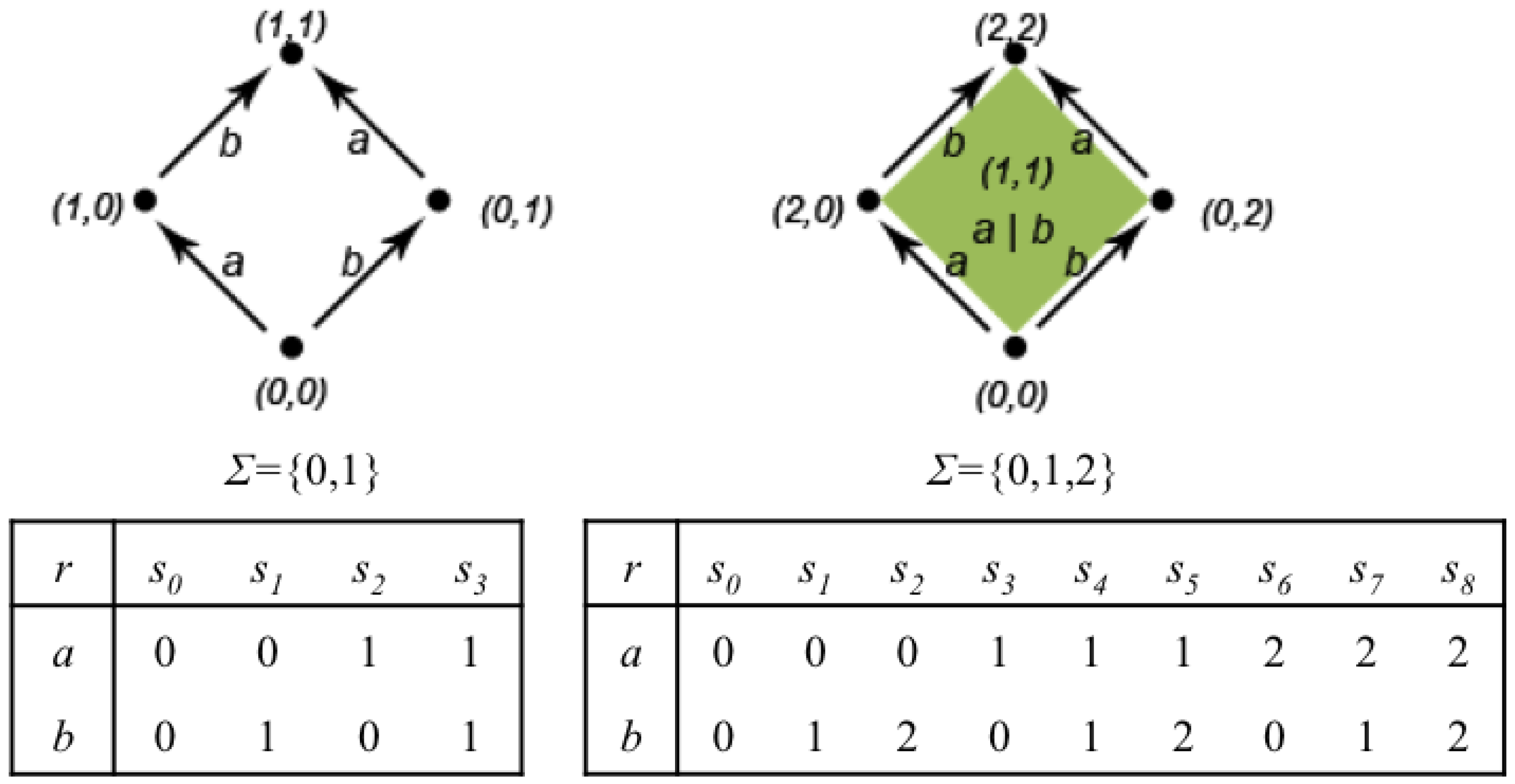 Figure 8 shows the representation as Chu spaces of the automata in Figure 7. The function r of the Chu spaces is represented as a matrix. Every column represents a possible state of the automaton. For instance, on the left, state is one where both a and b are unstarted; state is one in which a is still unstarted and b is finished, and so on. On the right, state is the one in which action a is unstarted and action b is executing; state is the one in which action a is executing and action b is finished, and so on.