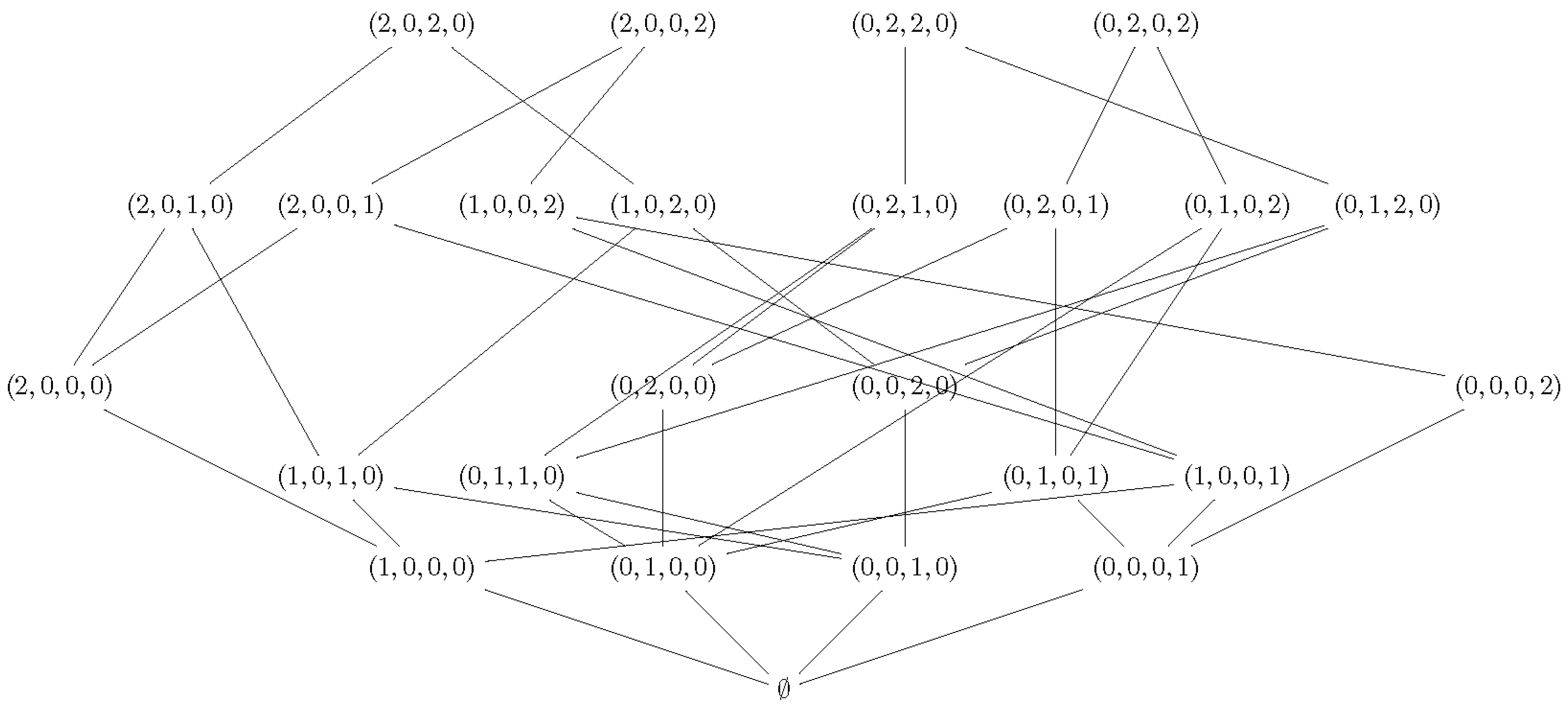 A graphical representation of a Chu space is often given using a Hasse diagram, which helps to easily deduce the set of admissible traces, dropping out automatically possibly forbidden states. In these diagrams, the computation proceeds in the upwards direction and represents an execution path in the automaton [33]. As an example, Figure 9 shows the Hasse diagram representing the Chu space of the HDA of Figure 7 (right).