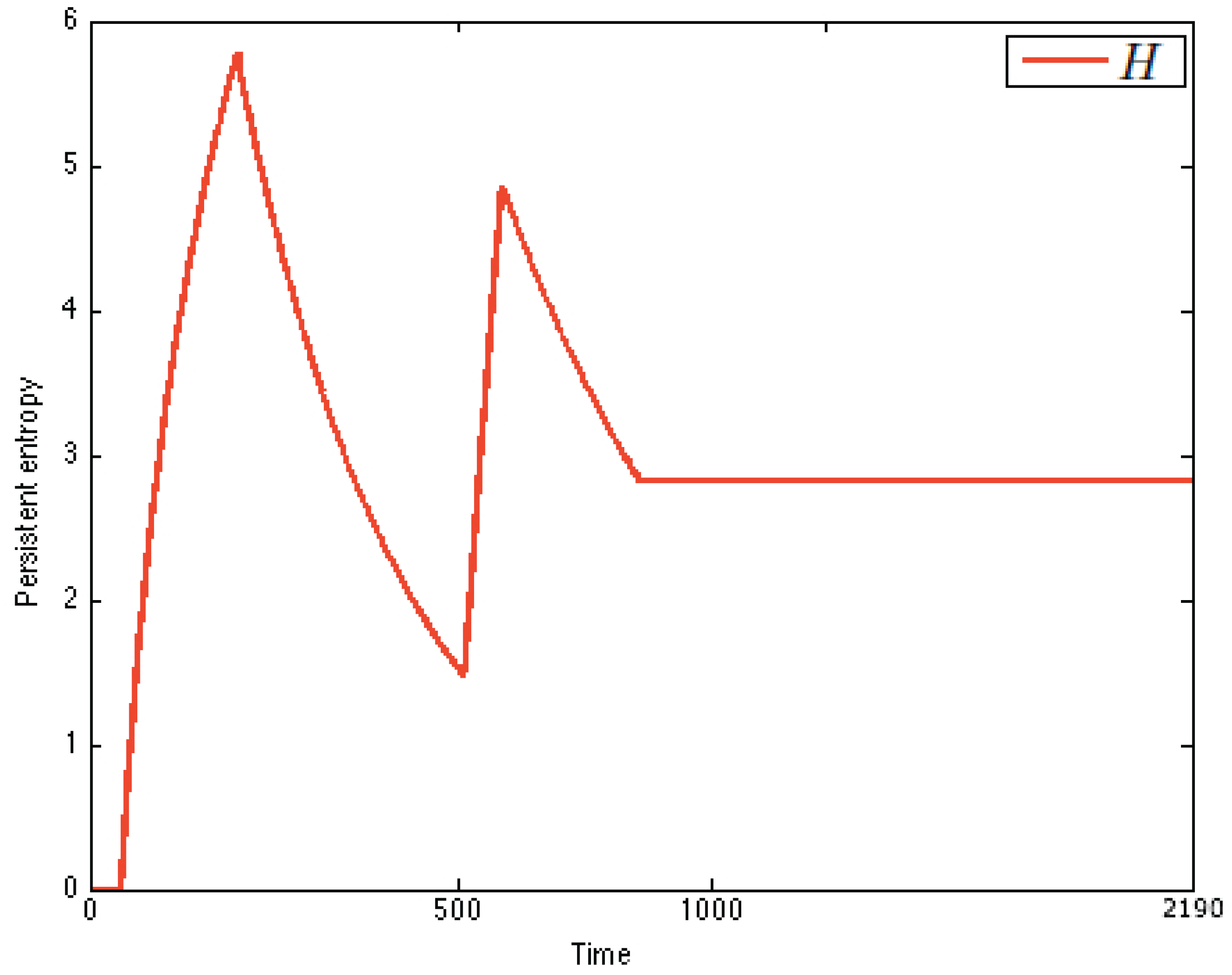 The value of persistent entropy associated with every observation at time t was calculated accordingly to the definition in Section 3.5. Note that in this case, it is possible to build a chart of H over time, because we know that the data are subsequent, as they come from the same simulation. In general, for comparing two values of H, one should define the so-called mass function [35].