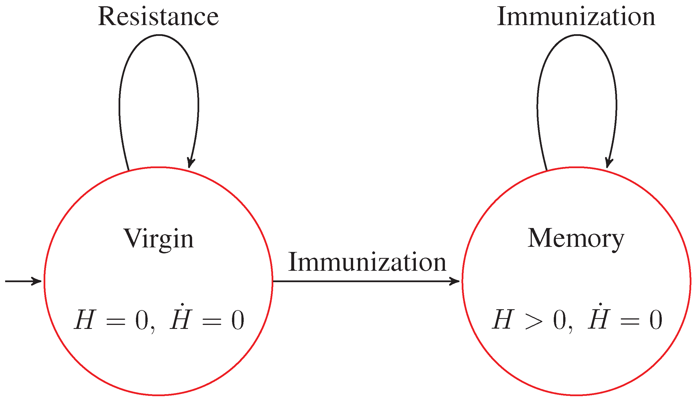 Finally, even if we do not observe it in our simulation, we know from domain-specific knowledge that when in the virgin state, if the received stimulus is not grater than a certain threshold, then the immune activation does not start at all, and after a while, the system goes back to the initial state again. This means that also in the initial state of the PEA, a self-loop transition should be added.