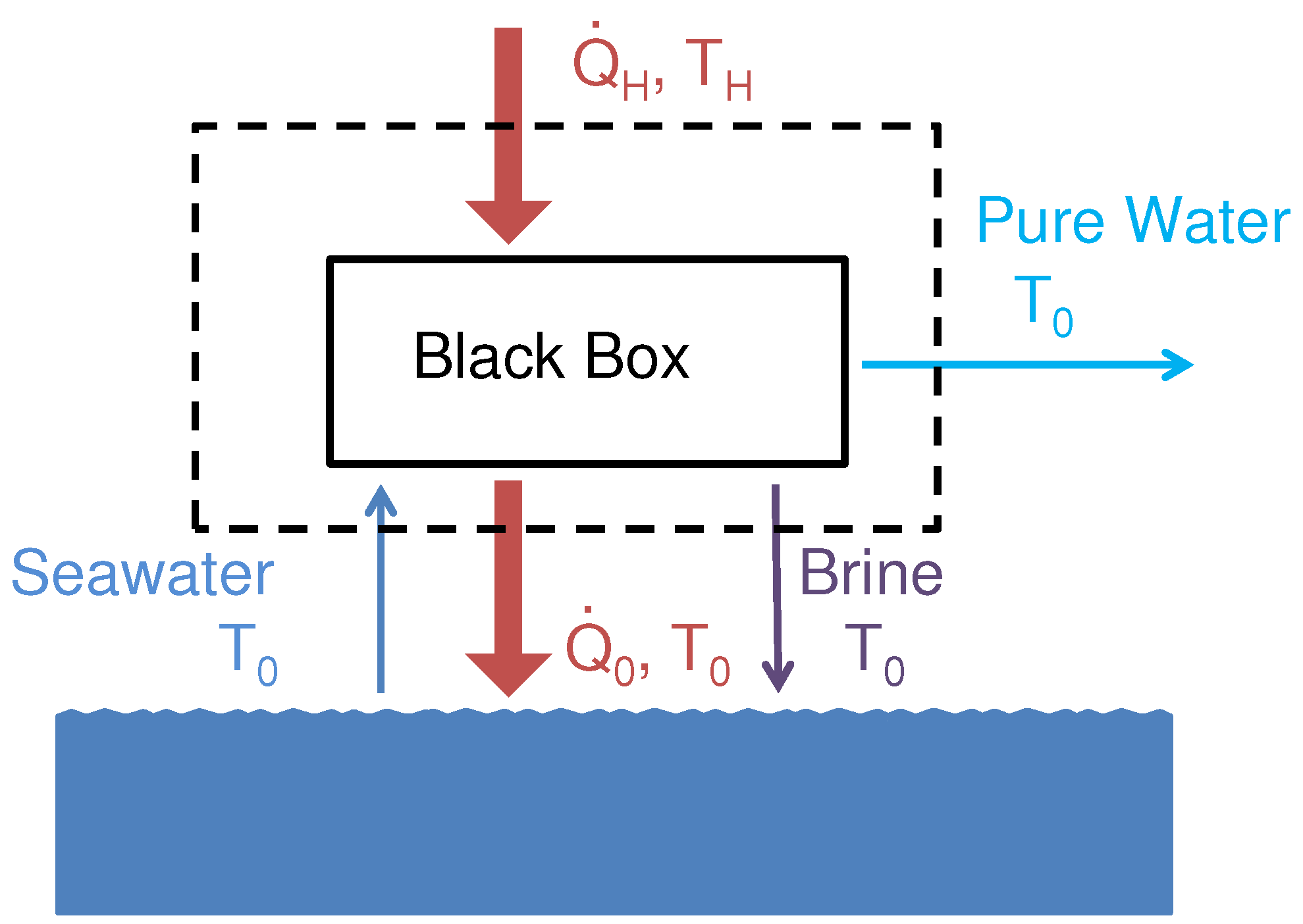 A control volume is selected around a black-box, waste heat driven desalination system such that the seawater (sw), product (p) and brine (b) streams are all at the environmental temperature, , and pressure .