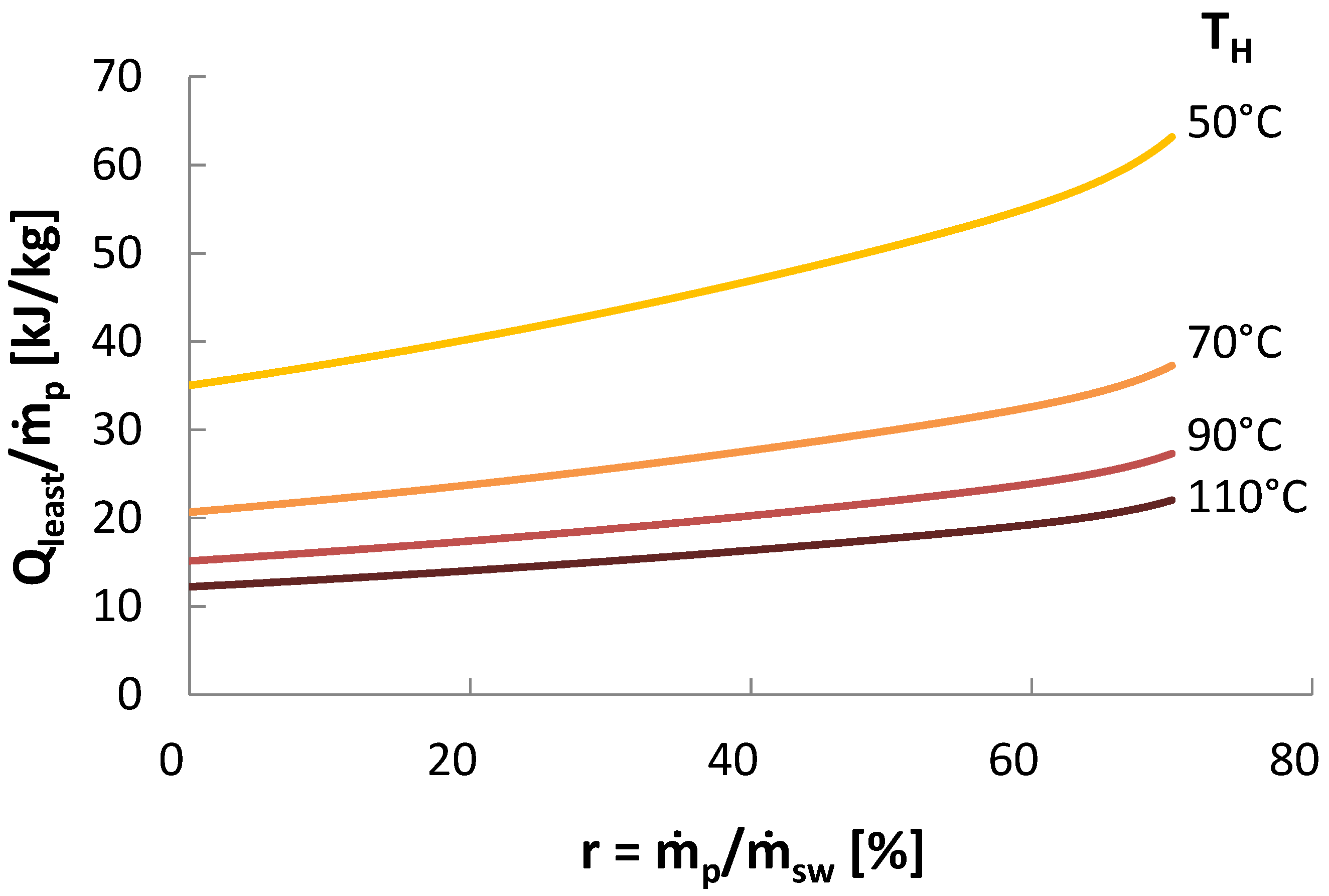 The least heat of separation is a function of both source temperature and recovery ratio, as shown in Figure 2 [16,18]. In the limit of infinite source temperature, the least heat approaches the least work.
