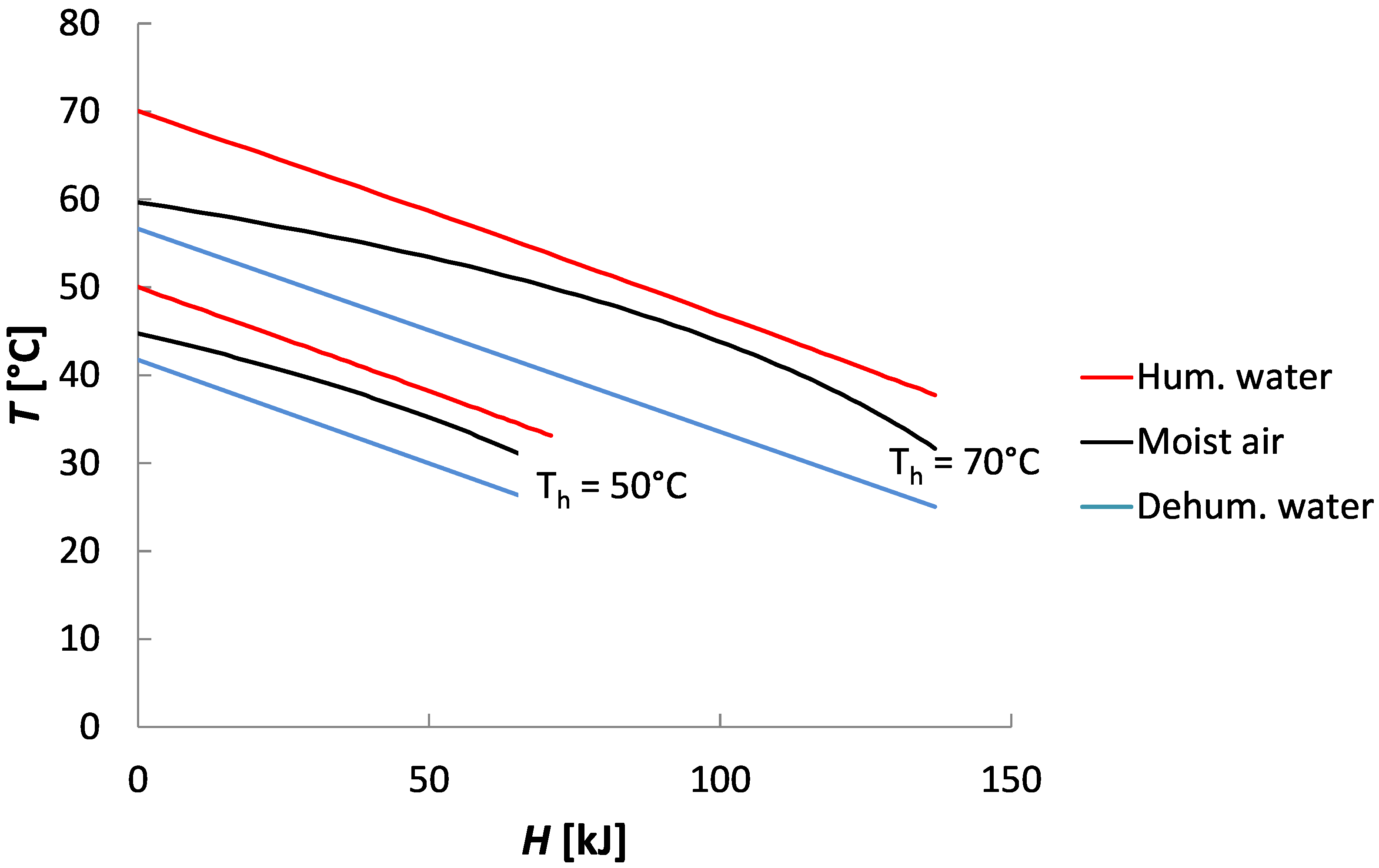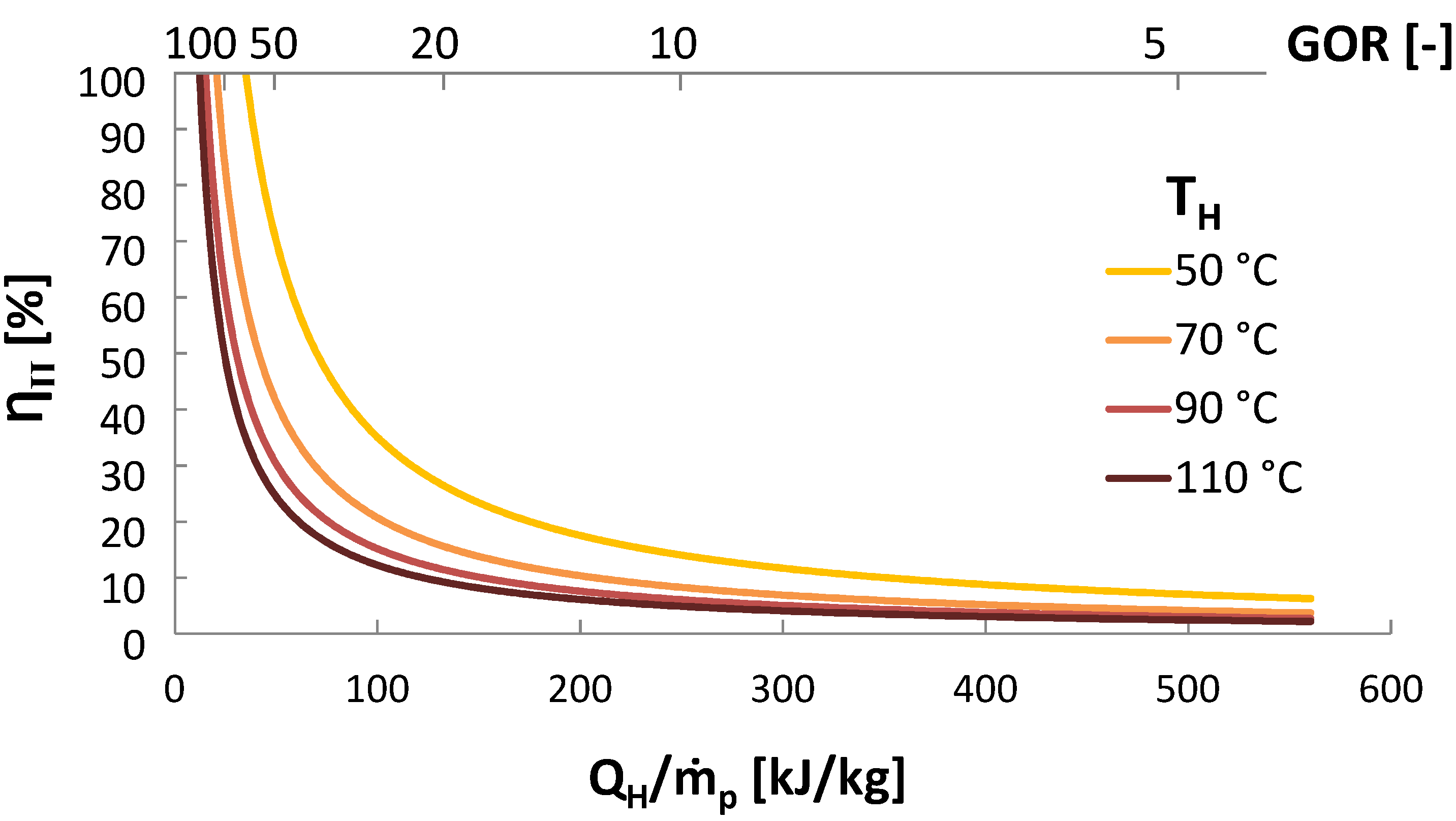 This becomes relevant when comparing technologies such as MED, which typically operate at 70 or below because of scaling issues, to technologies such as MSF, which may have a top temperature as high as 110–120 . To make a comparison where this temperature reduction is necessary for a fixed high temperature source, an efficiency may be used, which represents a ratio of the remaining available work divided by the original available work possible. This can be described in terms of waste heat temperatures by using , and assuming that the heat reduction occurs as a temperature gradient somewhere in the system, without losses to the environment.