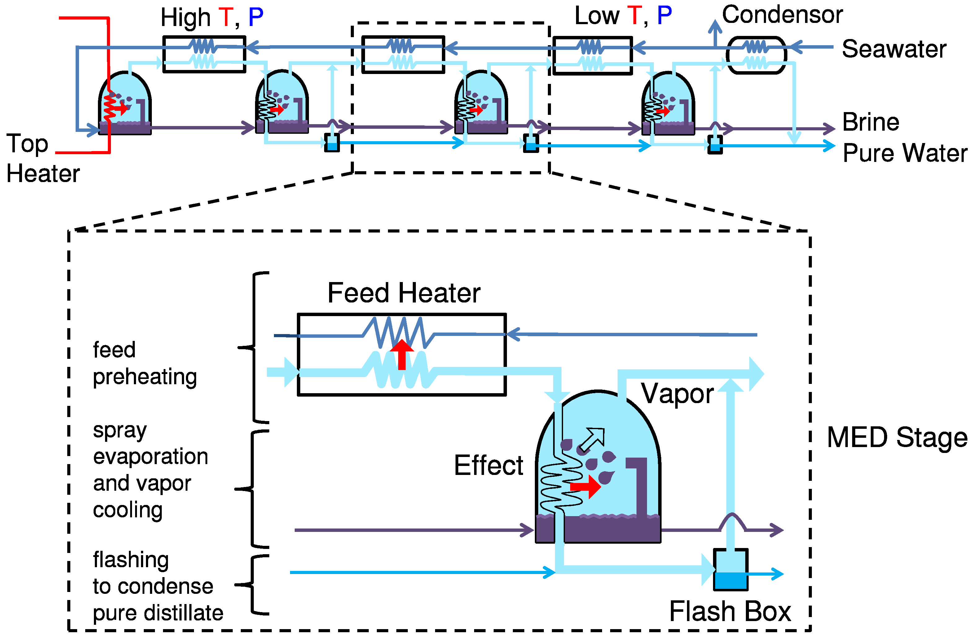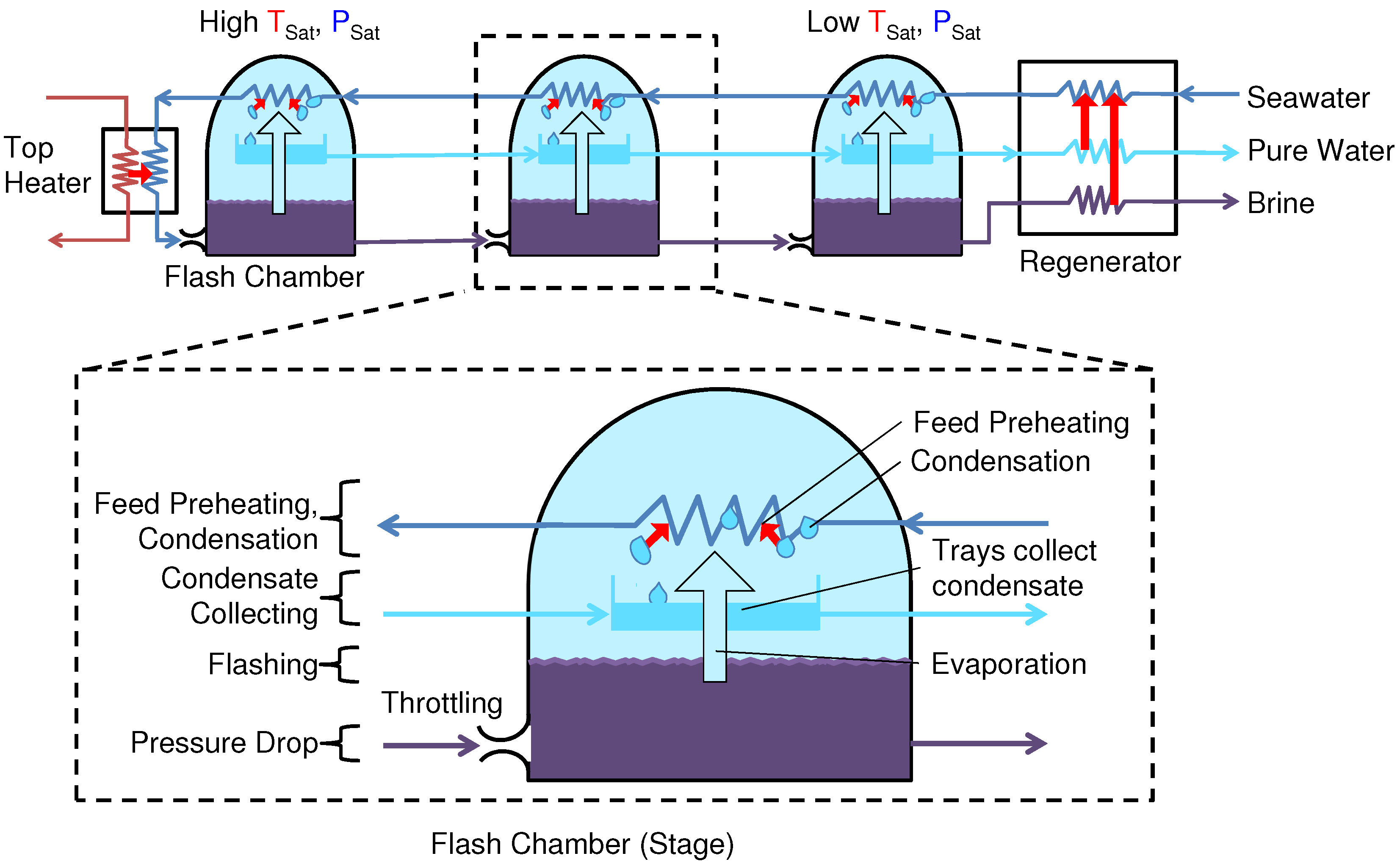A schematic diagram of a once-through MSF system is shown in Figure 6. A numerical model for this system was built in EES with values based upon a representative system [9]. In MSF, seawater enters successive saturated stages, where the pressure is lower because of a throttle. This pressure drop, or flash, causes water to condense as vapor, or “flash”. To condense the vapor while preheating the feed, a counter-current heat exchanger transfers heat between this flashed water vapor and incoming seawater [22]. A heater provides additional heat to the hot feed before the first and hottest stage, and after the coldest stage a regenerator exchanges heat between the exiting and entering streams.
