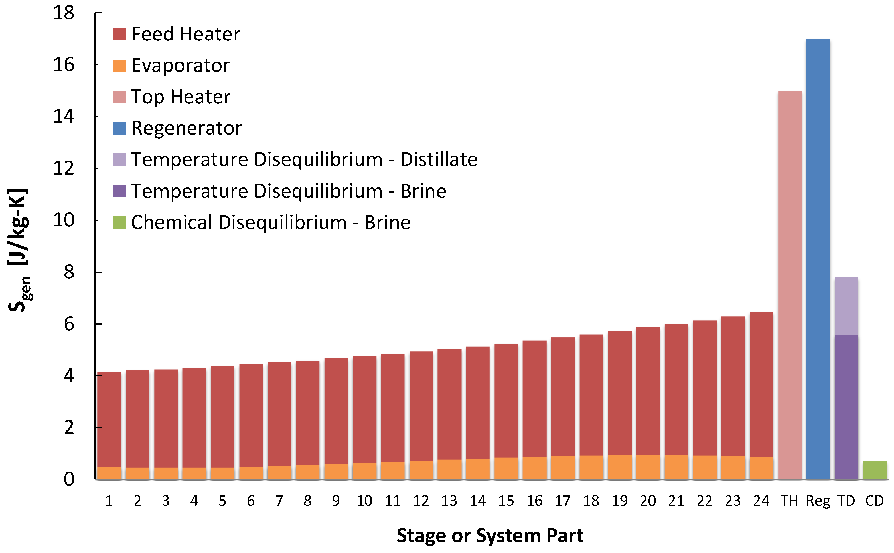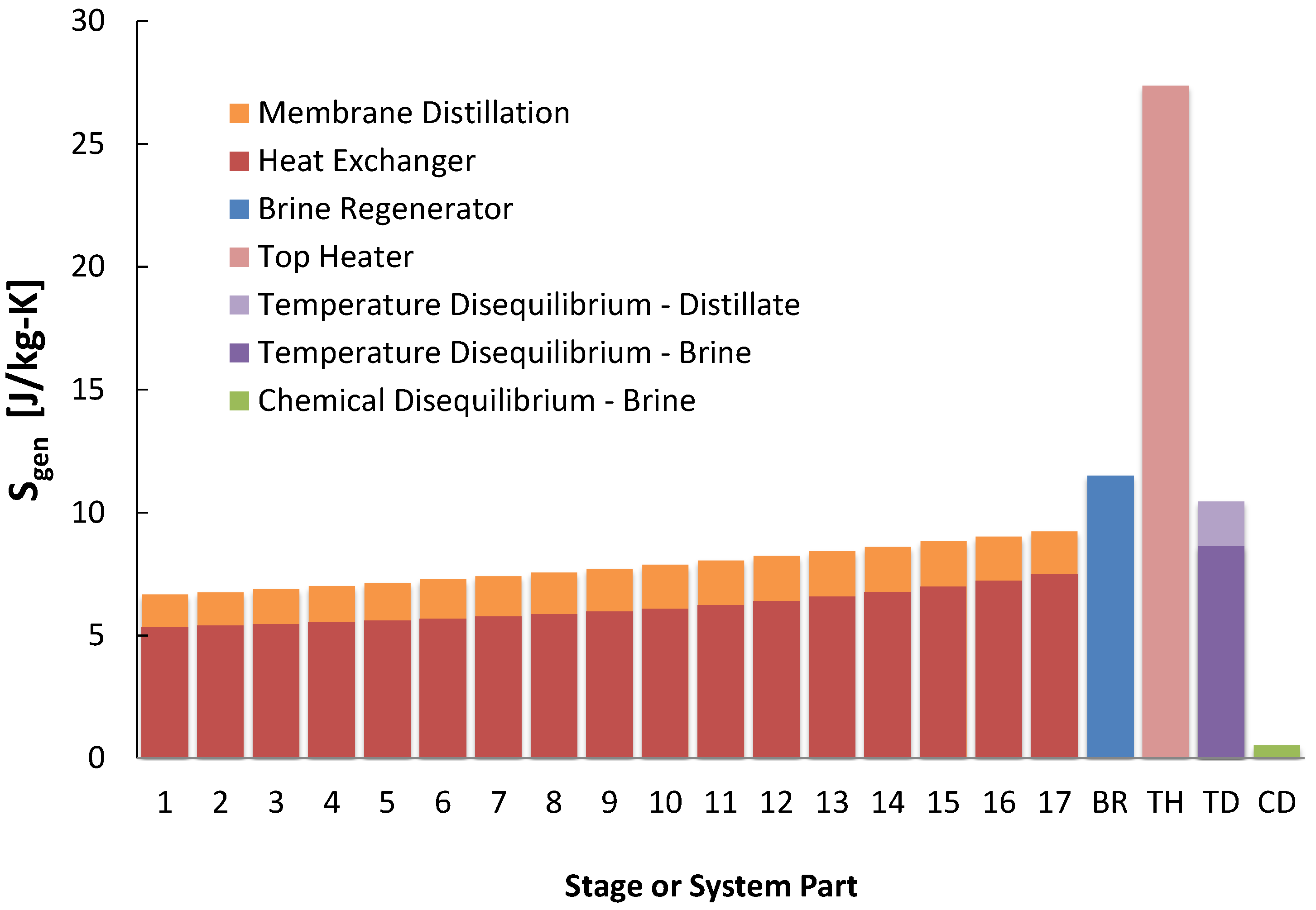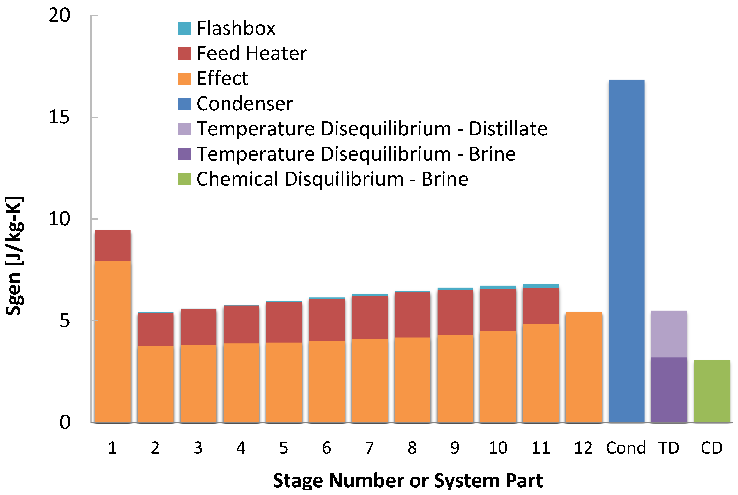Approximation 7, assuming stages must be removed to compare to different temperature sources, is crucial to comparing thermal systems driven by waste heat. In this assumption, for lower top temperatures, higher temperature stages are eliminated and the remaining stages are not changed in all ways possible, retaining their temperatures and product production rates. The rational for keeping the number of stages constant for a given temperature difference is the assumption that the components and set-points of existing real-world systems are thermally and economically optimized. The lower stages, depending on the technology, are roughly independent from the higher temperature stages, so removing higher temperature stages should have minimal effect on the subsequent stages. This approximation neglects re-optimization for the change in brine salinity, which is acceptable since the brine salinity only slightly affects thermal desalination system thermodynamics. The approximation also neglects the different flow rate of the product stream, which is acceptable, because the entropy generation in the stages and product stream components varies little between different source temperatures.