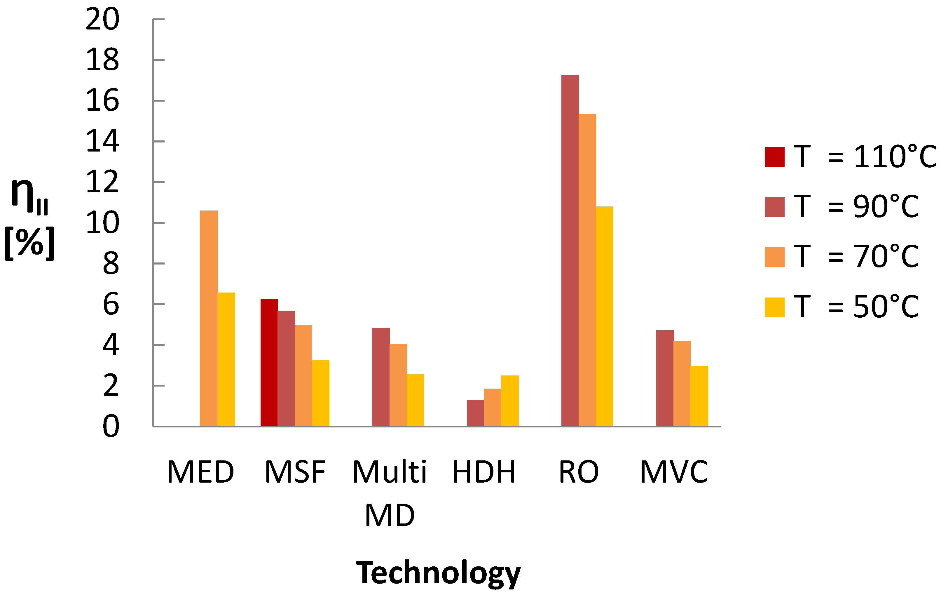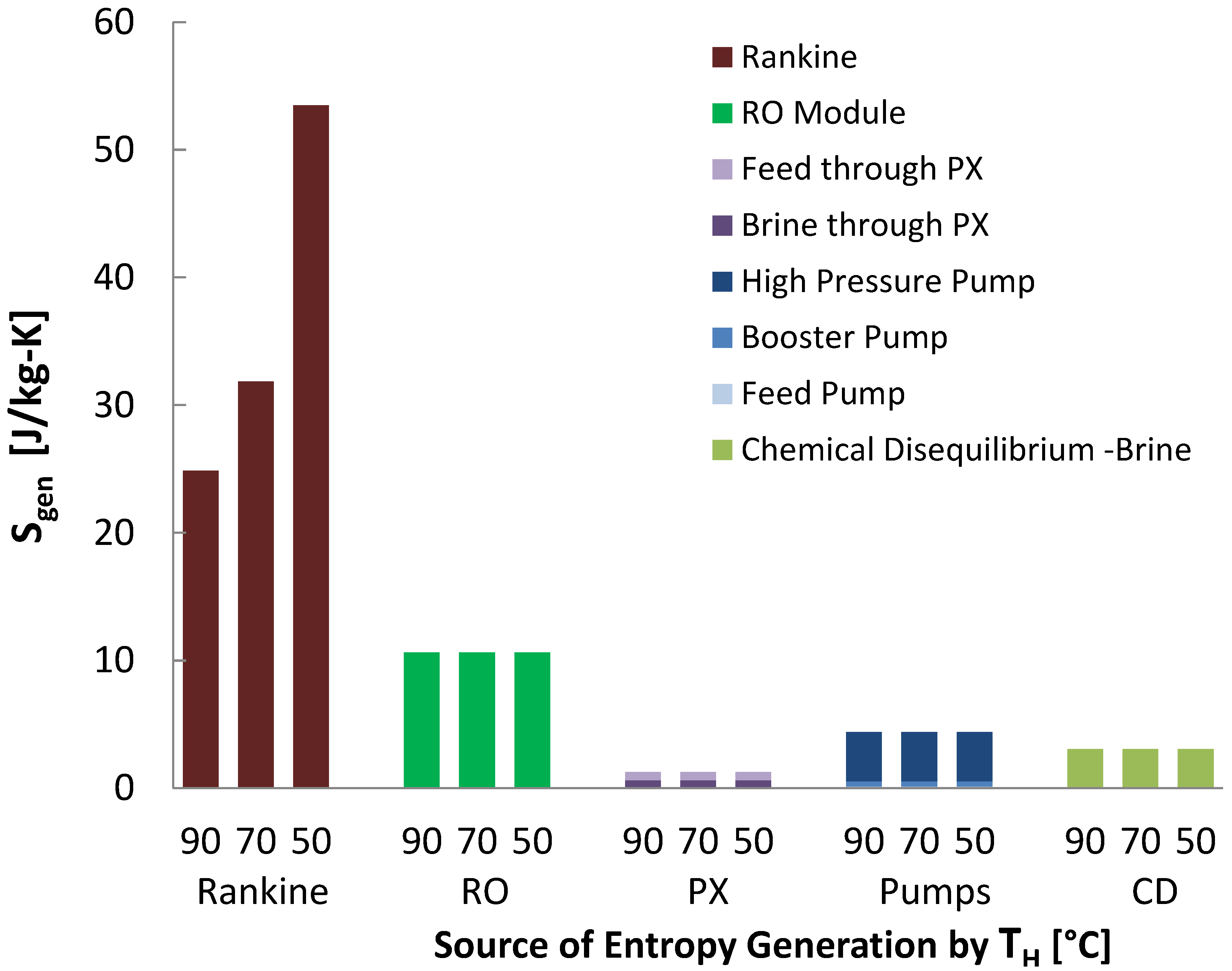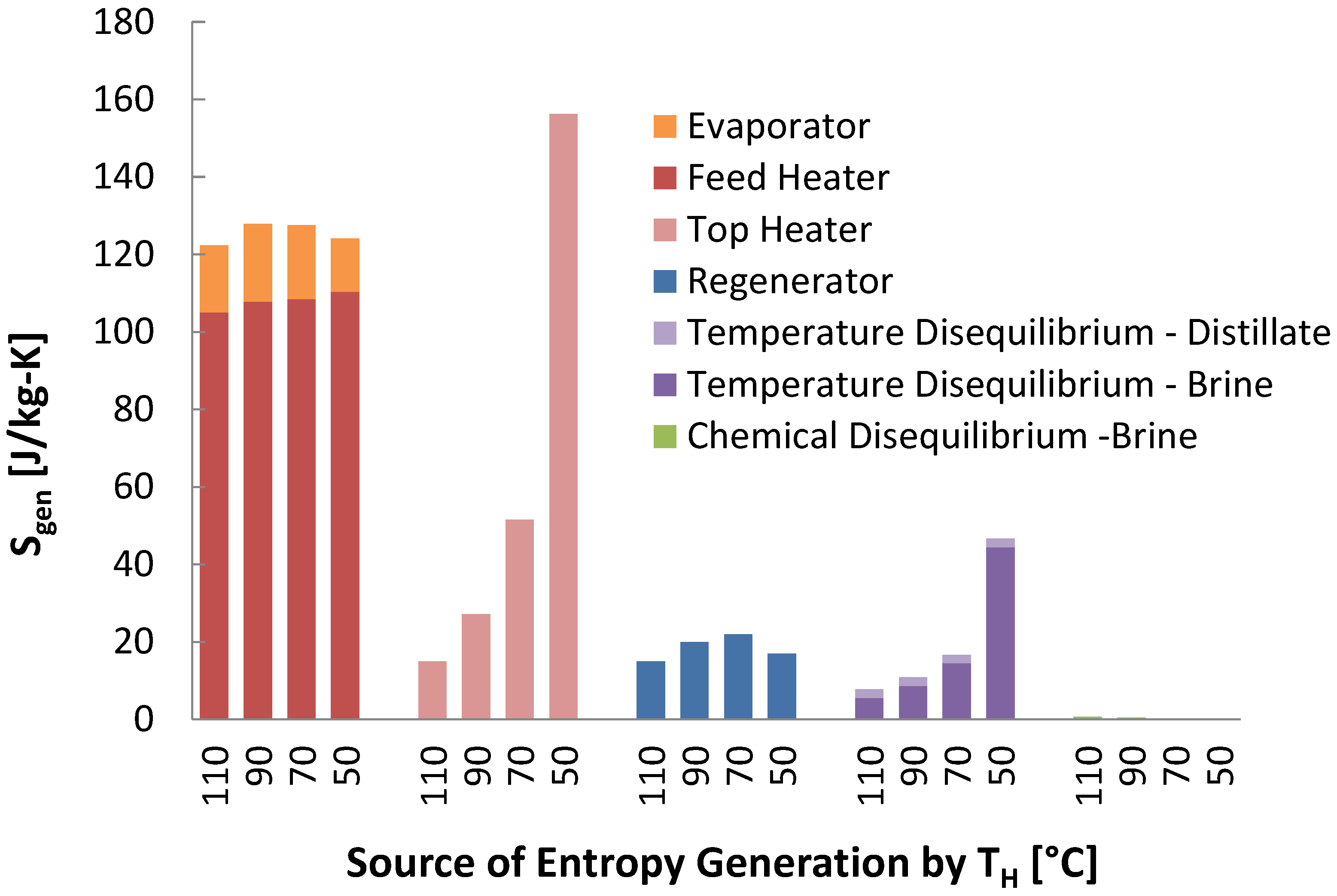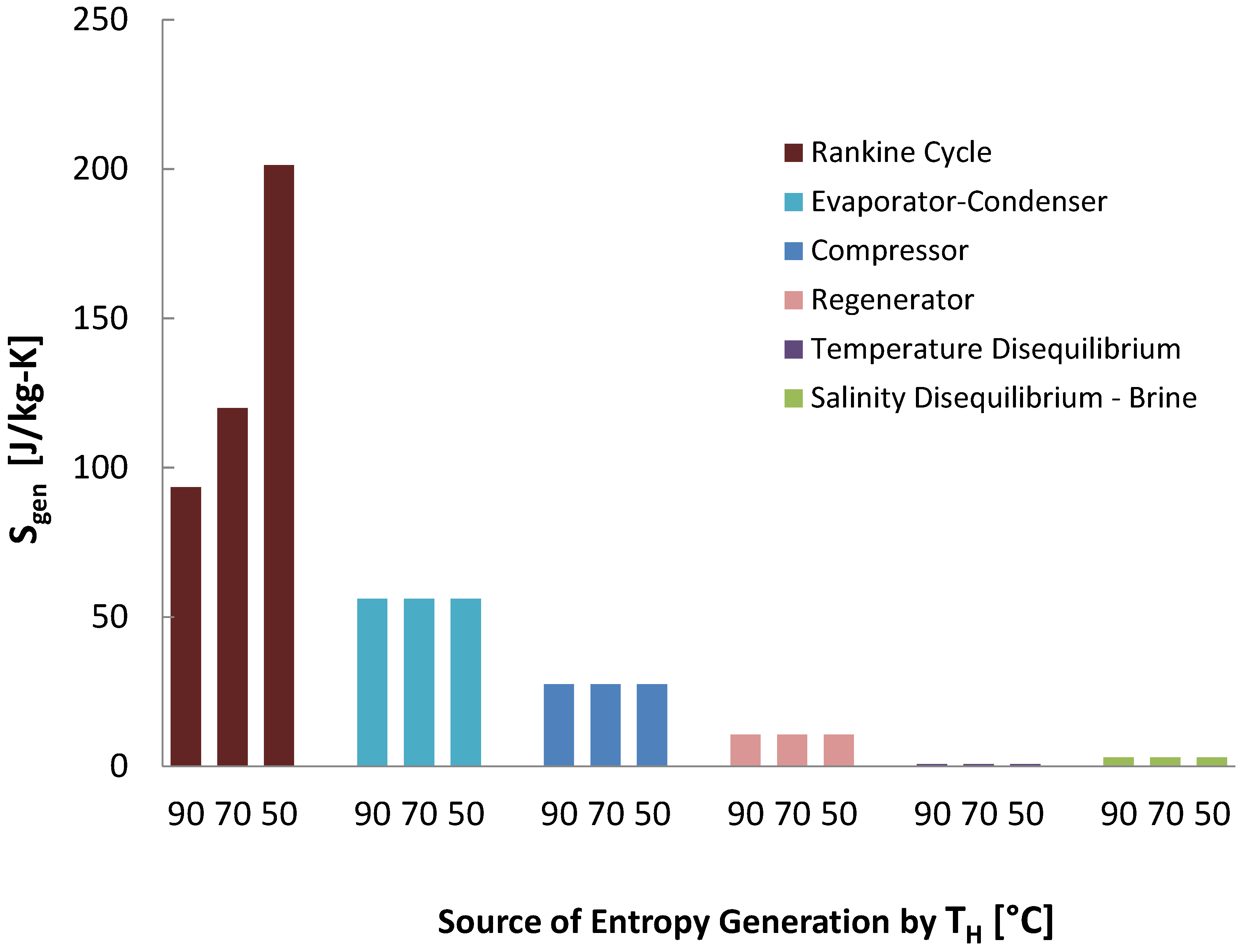 Systems are compared to one another through the Second Law efficiency, which compares the least exergy required to produce a kilogram of fresh water to the actual exergy input required by the system at a given temperature [16]. To illuminate how heat source temperatures and system design affect the relative performance of each technology, the key sources of irreversibilities in key system components are analyzed at different waste heat temperatures using analytical models for several different technologies. The irreversibilities analyzed included entropy generation in throttling to produce vapor (flashing), fluid expansion without phase change, pumping, compression, heat transfer, and mixing of streams at different temperatures (thermal disequilibrium) and different salinities (chemical disequilibrium) [17]. These results are used to compare the relative performance of technologies at different heat source temperatures, and to analyze which components are responsible for the major inefficiencies at different temperatures.