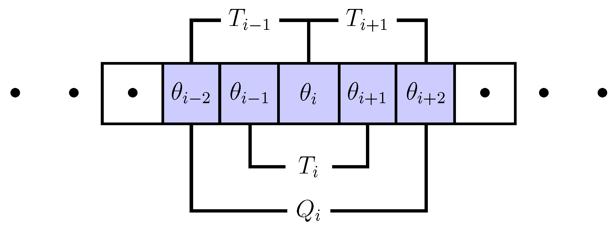 This equation leaves us with the further specification of the triplet probability, . While, according to our 1st assumption, the occurence of is just determined by the nearest neighbors , the occurrence of either or also depends on their nearest neighbors, i.e., the second nearest neighbors of i, . That means a quintuplet decides about the value of the triplet in the next time step. If we consider a quintuplet configuration , then we can define the triplet probability as the marginal probability: