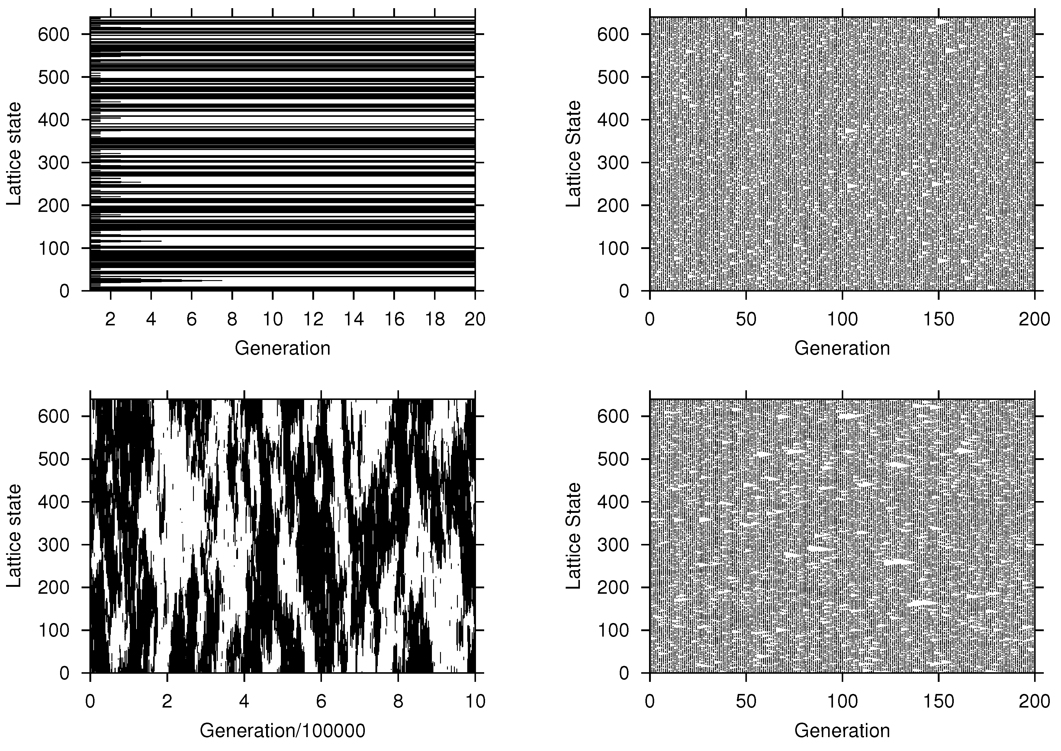 Evolution of the cellular automaton (CA) for different rules: (left column) majority voting; (right column) minority voting; (top row) deterministic dynamics; (bottom row) stochastic dynamics. Parameters: (top left) , , (top right) , , (bottom left) , , (bottom right) , . , initial condition: , (black) indicates , (white) indicates .