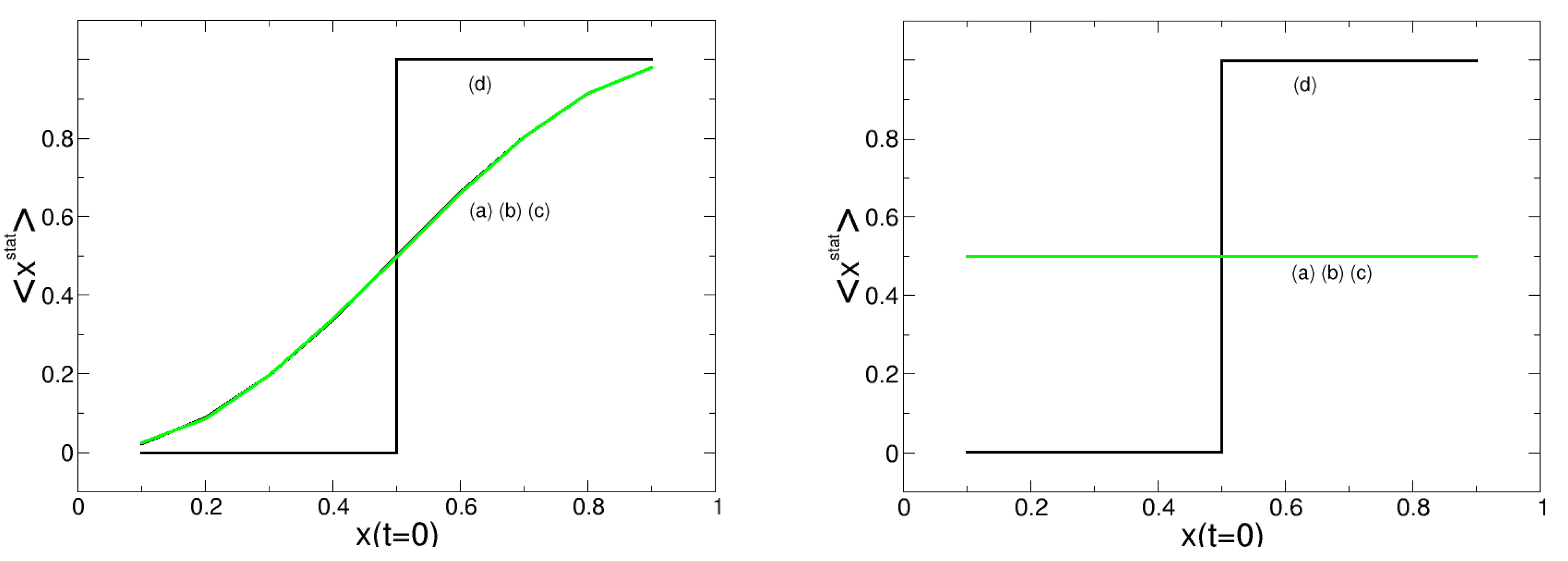 Stationary solution for majority voting. (left) deterministic case, , ; (right) stochastic case, , . Curves from different approaches: (a) cellular automaton (CA) simulation (reference case, green); (b) quintuplet approximation; (c) pair approximation; (d) mean-field approximation.