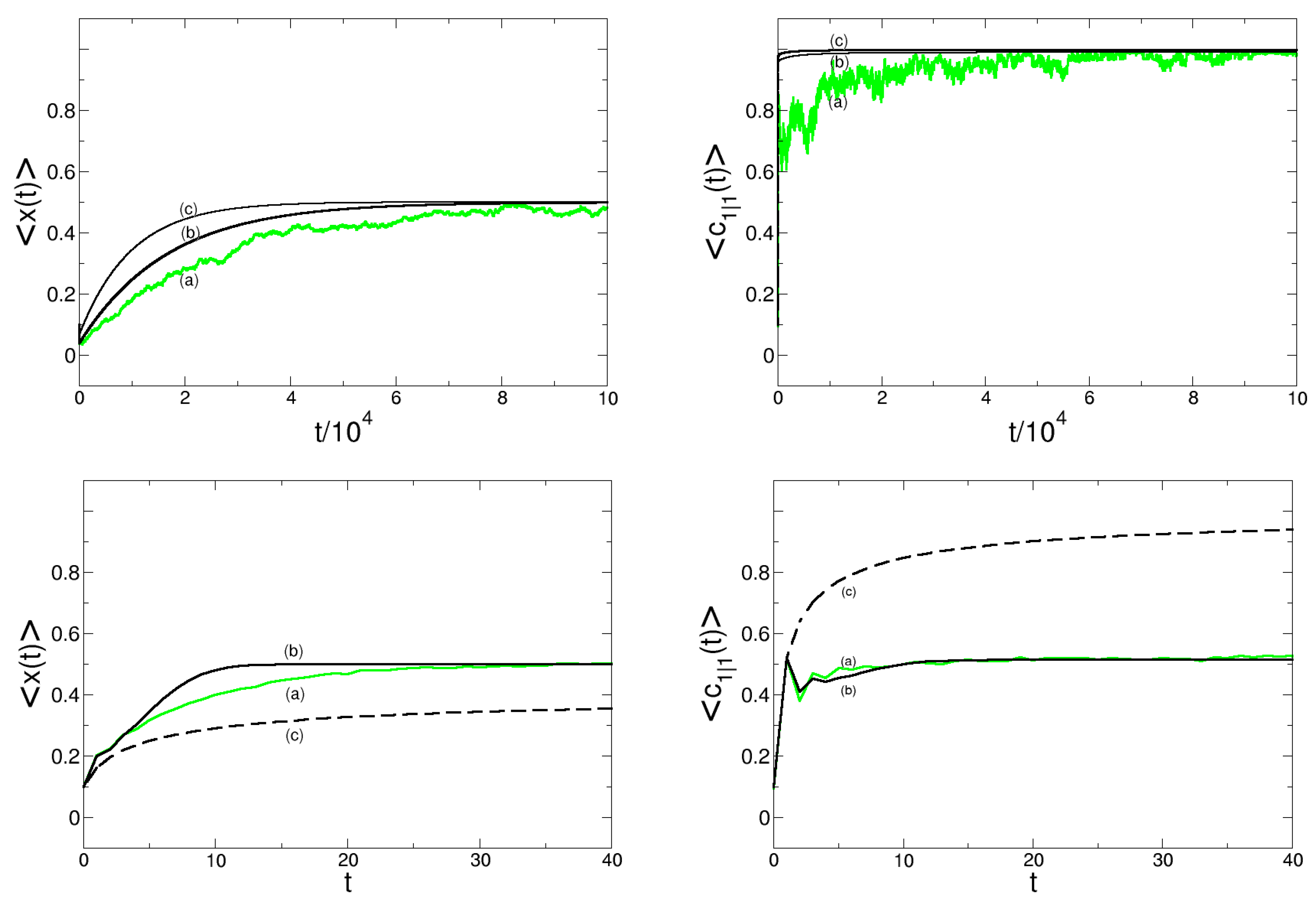 Our last remark is about the coexistence of the two opinions, which is the more interesting scenario compared to consensus, i.e., the existence of only one opinion. Here, we are not so much interested in the trivial case of random coexistence without any structure formation, which is characterized by and . We focus more on the case of correlated coexistence which has an interesting complexity because of the formation of local structures, nicely shown in Figure 2 (lower left). On the level of our approximations, this state is characterized by and . i.e., both opinions form at times large domains, indicated by the high pair correlation, but none of the two opinions entirely dominates the dynamics, as the expected value for its fraction is about 0.5.