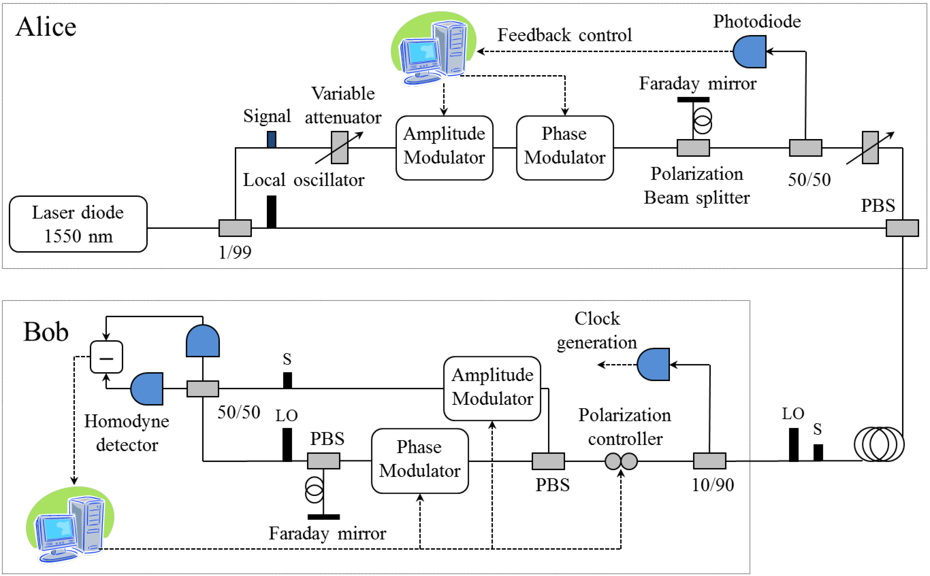 Optical layout of a fiber optic CVQKD system implementing the GG02 [22] protocol with homodyne detection.