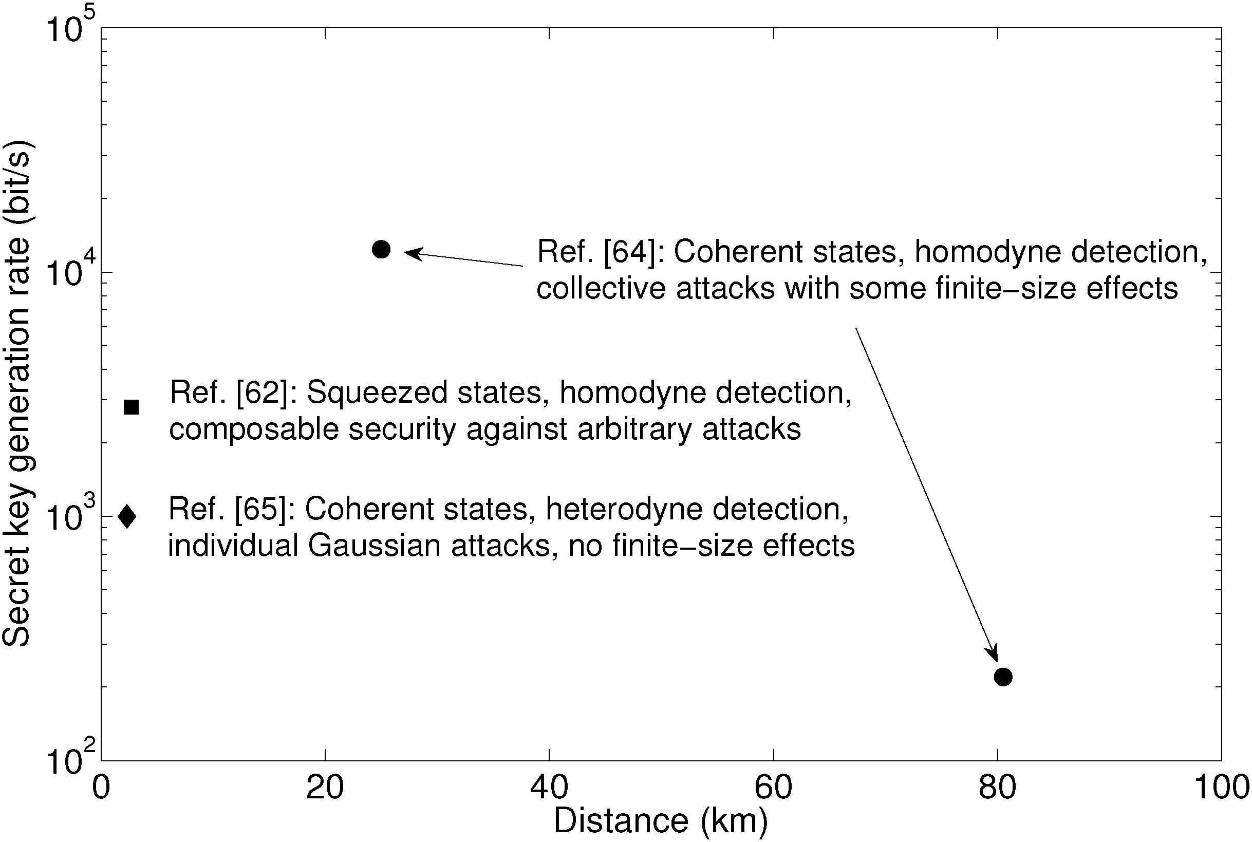 In the previous sections, we have seen that continuous-variable QKD protocols may vary in terms of required resources, in particular for state preparation (squeezed or coherent states) and detection techniques (homodyne or heterodyne). These choices are of great importance for the security achieved by the corresponding implementations (see Table 1), but also affect their performance, which is typically quantified by the maximal distance over which secret keys can be generated and the rate of their production. Another important choice is the medium used for the transmission of the quantum keys, namely optical fiber or free space, which depends on the targeted application of the QKD implementation. It is interesting to remark here on a historical note that initial proposals for CVQKD necessitated the use of squeezed states and were burdened by a 3-dB loss limit [41,53], which greatly limited their practical interest in any realistic communication scenario. Later, however, protocols using coherent states appeared (GG02) [22], and the 3-dB limit was lifted [20,25]. These results enhanced considerably the interest in the use of continuous variables for QKD and were at the basis of a series of works that led to ever better performing systems.