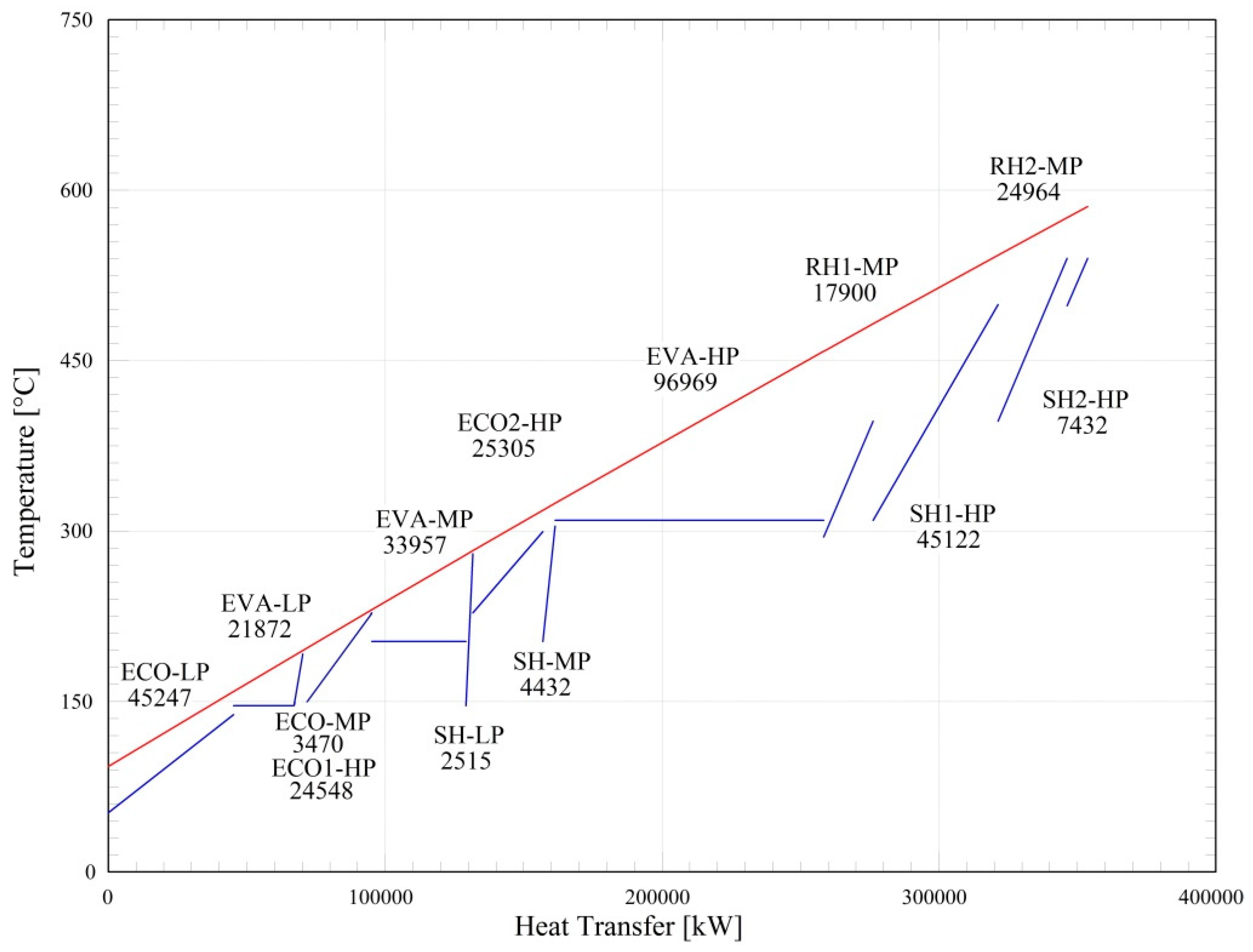 Inputs to the on-design model. In addition to the common inputs, the pinch points of the evaporators, the sub-cooling temperatures of the economizers, the steam outlet temperatures of the super-heaters are fixed for each pressure level. Figure 3 shows the T-Q diagram of the HRSG in design conditions. The length of the lines on the horizontal axis shows the transferred heat rate and the vertical axis shows the temperature levels. Since, in the parallel economizers (ECO1-HP and ECO-MP), heat is exchanged simultaneously between one stream of flue gases and two streams of water, the heat transferred in each economizer cannot be illustrated properly in the T-Q diagram. Therefore, in order to distinguish the heat duty of each heat exchanger, the parallel economizers are shown in series. The numbers below the specified heat exchangers in Figure 3 are the transferred heat to the water side in kW. Starting from all these inputs, the mass and energy balance equations of the system are closed, the remaining properties of all the streams are computed and the geometric features of the components are derived. The on-design model is validated by comparison of the results with the operation data available from the power plant.