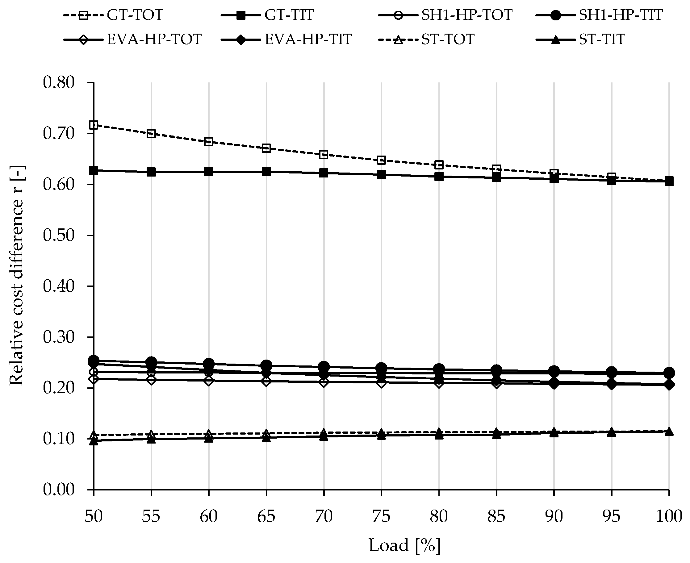 An increase in the Relative cost difference represents an increase of the specific cost of the product of the component, with fixed cost of the fuel—this mirrors a decrease in the efficiency. The results show that, although the TIT control always leads to a globally higher efficiency, some components may individually be more costly. Therefore, improvements may be considered for these components. Specifically, for the gas turbine, the performance is better with TIT at partial load, while the performance of the high pressure evaporator and first high pressure super-heater is worse with TIT control.