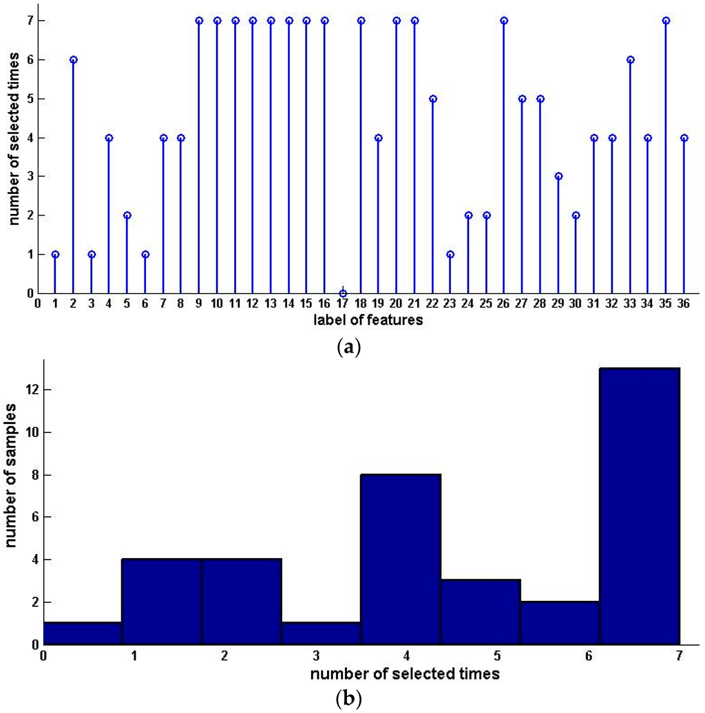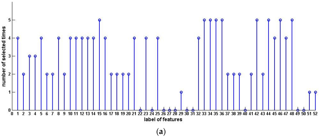 For the forward algorithm, features 4, 11 and 1 are selected from data set 1, features 4, 11 and 1 are selected from data set 2, and features 4, 11 and 22 are selected from data set 4. Features 4 and 11 are included in all feature subset. The top two of three selected features are the same and only the last is different for all data sets. As for the backward algorithm, however, we have an entirely different situation. Features 17, 18, 20 and 22 are selected from data set 1, features 1, 3, 4 and 5 are selected from data set 2, and features 4, 10 and 16 are selected from data set 3. The selected feature subsets are totally different. Obviously, we can conclude that the forward algorithm is more stable and the backward algorithm is affected more by the order of features.