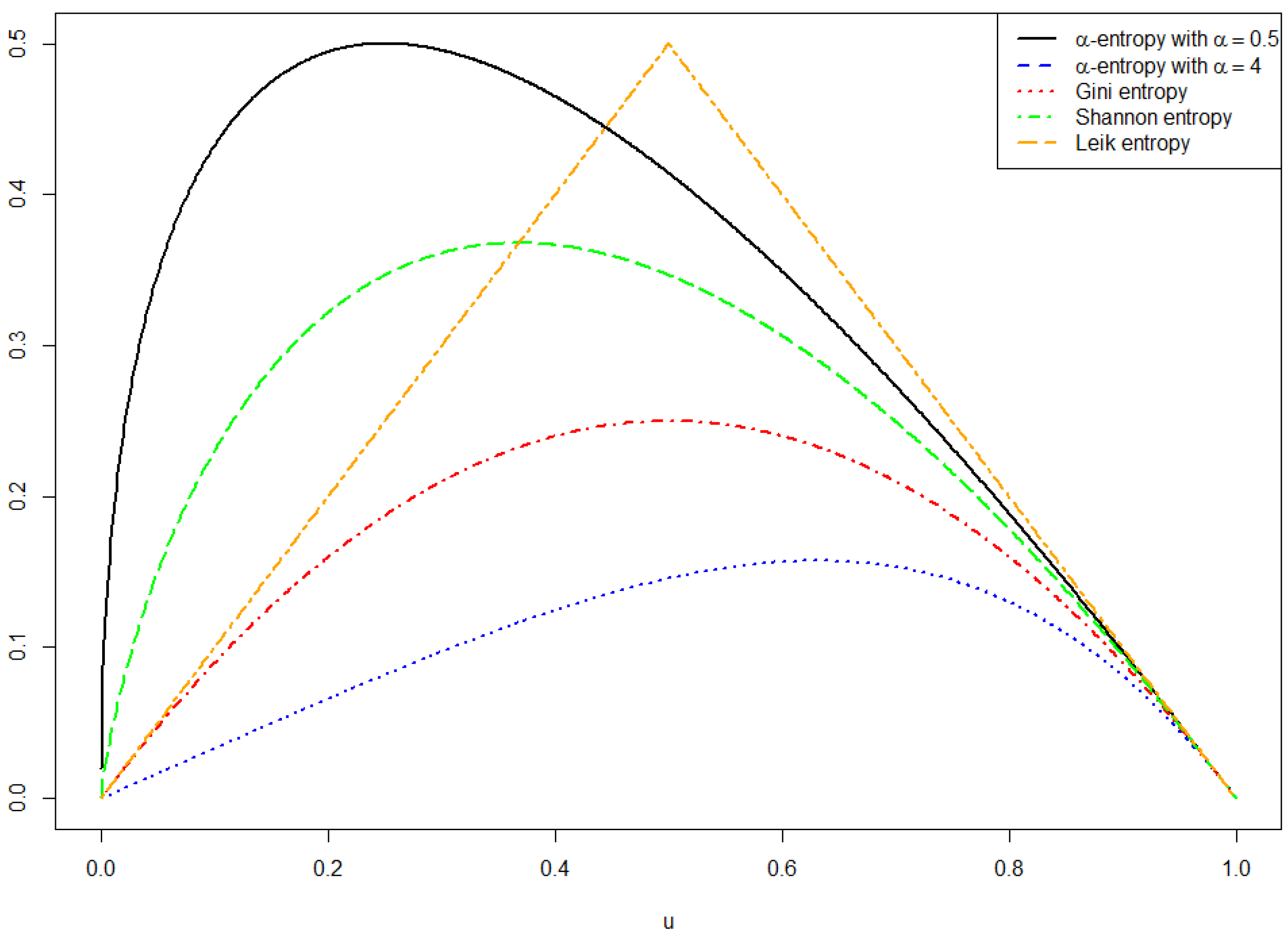 To the best of our knowledge, Equation (5) was initially introduced by [12]. However, they did not consider the entropy for a cdf F. Instead, they were concerned with a so-called membership function that quantifies the degree to which a certain element x of a set Ω belongs to a subset . Membership functions were introduced by [13] within the framework of the “fuzzy set theory”.