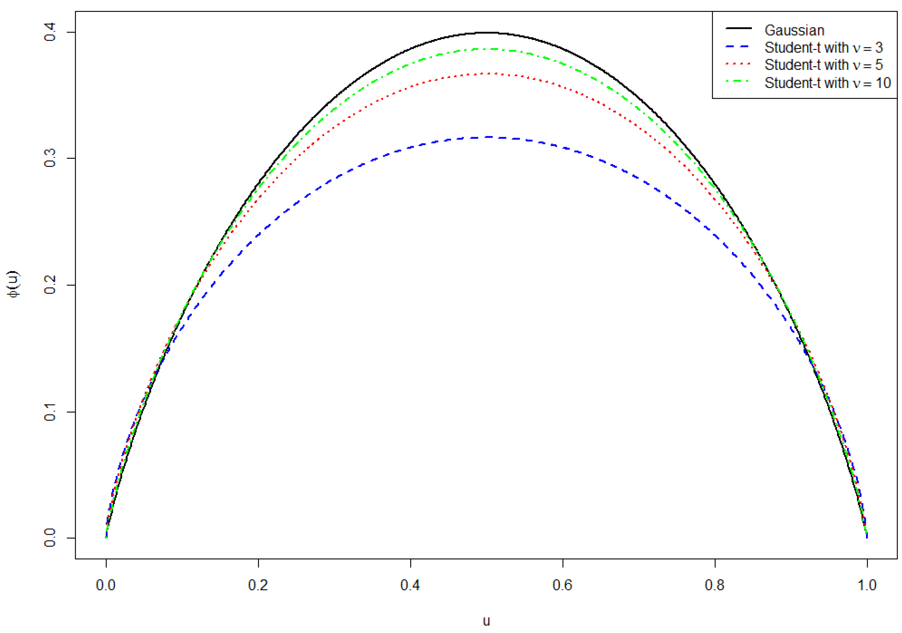 where cdf F is absolutely continuous, means “cumulative paired entropy”, and φ is the “entropy generating function” defined on with . We will assume that φ is concave on throughout most of this paper. In particular, we will show that Equation (2) satisfies a popular ordering of scale and attains its maximum if the domain is an interval , while a, b occur with a probability of . This means that Equation (2) behaves like a proper measure of dispersion.