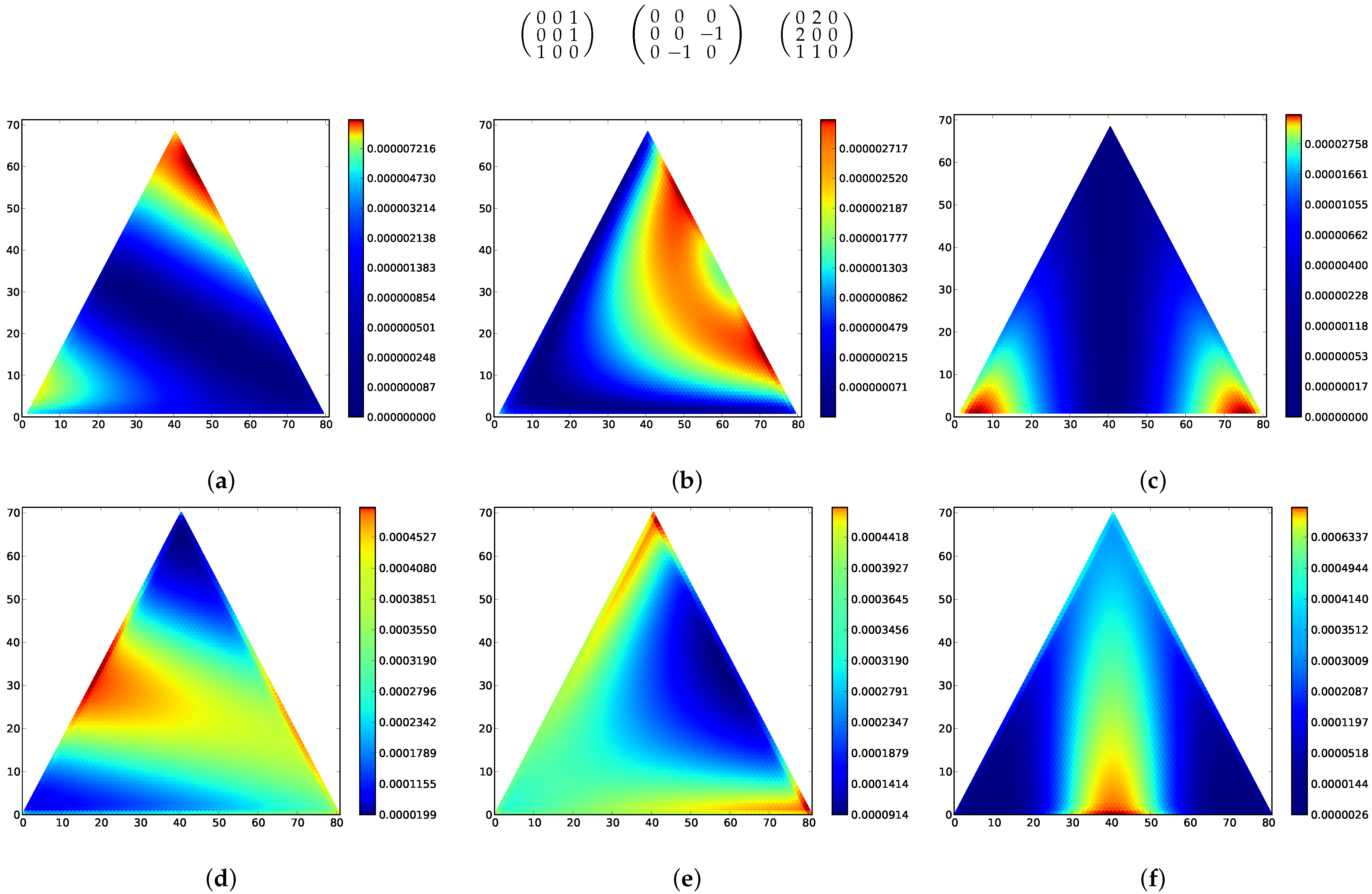 It is possible to have multiple interior stationary stable states for the replicator incentive with . For example, the following parameters give a process with two local maxima of the stationary distribution: , , , and the neutral fitness defined by . It is also possible to have an internal local stationary maximum as well as a boundary maximum, e.g., for , , , , fitness landscape defined by , , , .