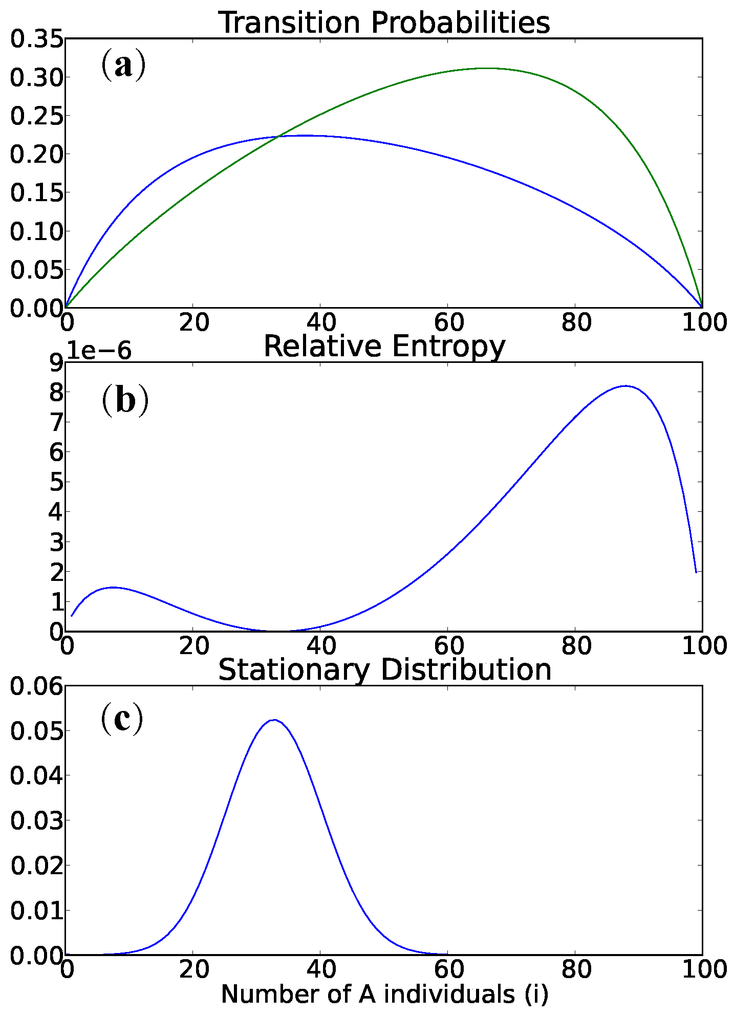 Let the fitness landscape be defined by the q-replicator incentive and the game matrix , (the Moran landscape with relative fitness ) and let for . As shown in [24], for there is an internal candidate ISS. We consider three cases. For , there is no ISS (the transition probabilities never intersect), and no internal local maximum of the stationary distribution. The latter is true for as well, but there is a state where the transitions intersect, and is locally minimal at this state (), which shows that a candidate ISS need not be stable in the sense of the stationary distribution. An imbalanced mutation rate can force an internal equilibrium for , for instance with and . For , the projection incentive, there is a local maximum of the stationary distribution (at ). It is unique and is minimal.
