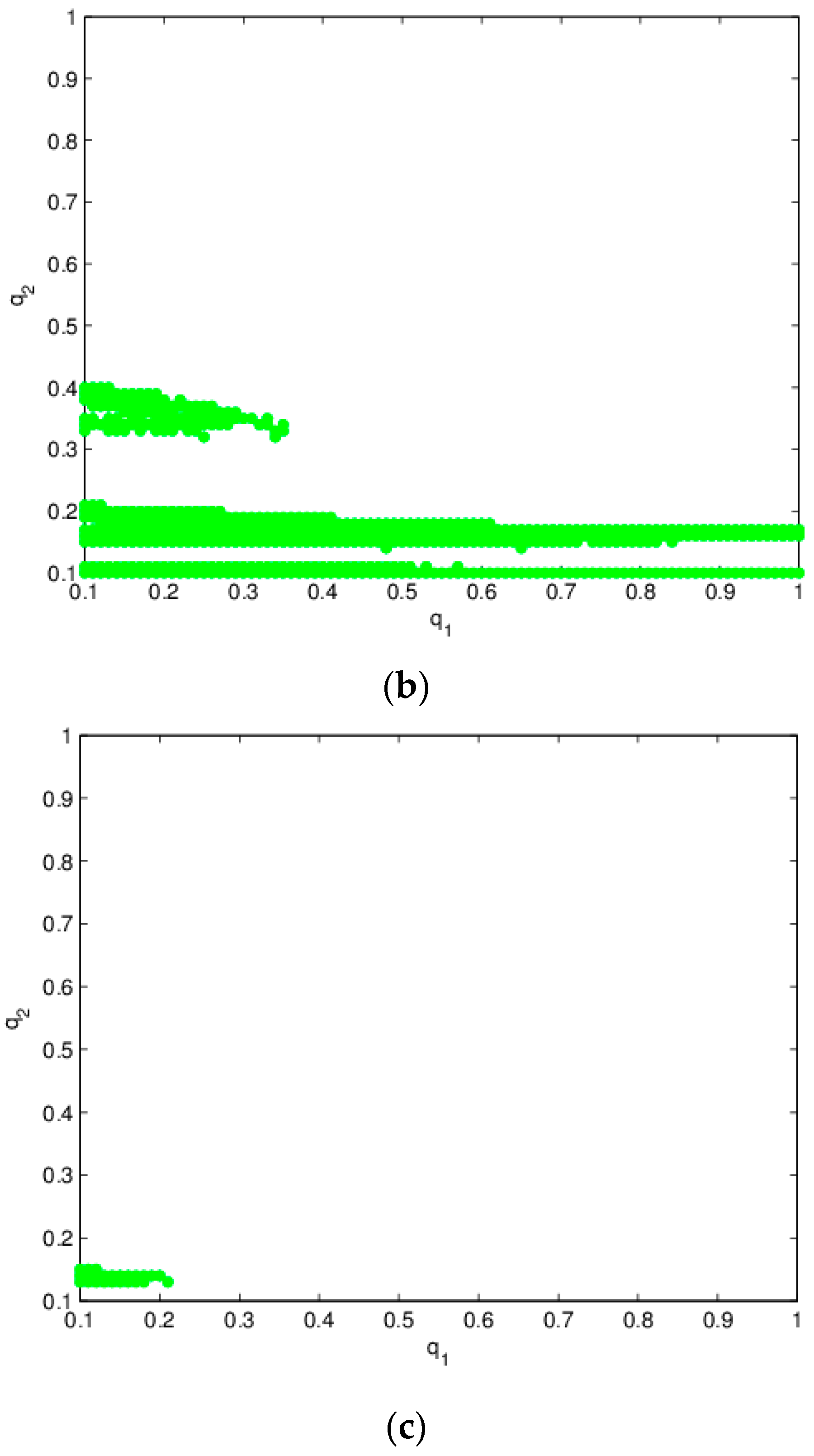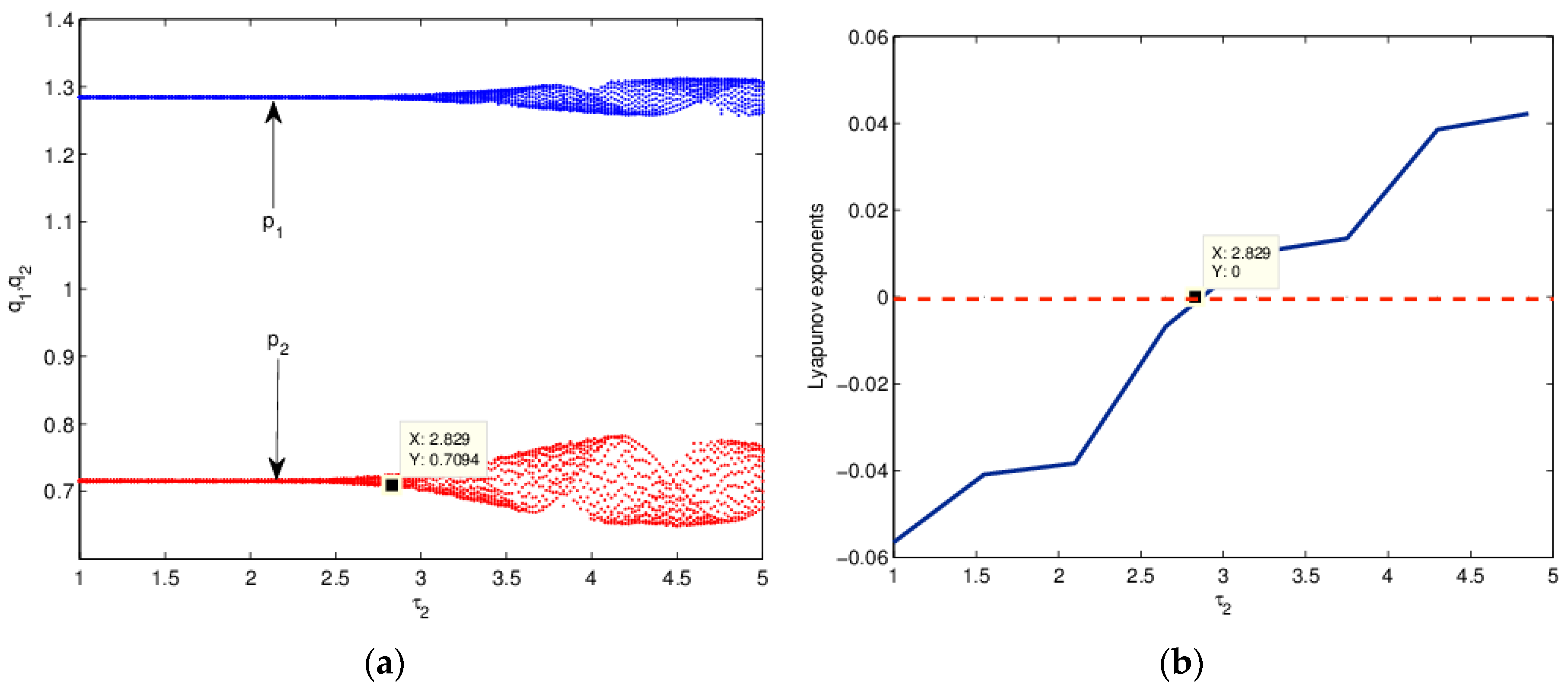 Figure 1a is a bifurcation diagram about of Equation (25). It can be seen that as increases, the system undergoes bifurcation at . That is to say, the system will lose its steady state, even descending into chaos. Figure 1b represents the largest Lyapunov exponent with respect to . A Lyapunov index value less than 0 indicates that the system is stable; a value greater than 0 indicates that the system is instable, even chaotic; when the value equals 0, the system undergoes bifurcation. From Figure 1b we can see that the system has bifurcation at . This is consistent with the conclusions of the theoretical analysis.
