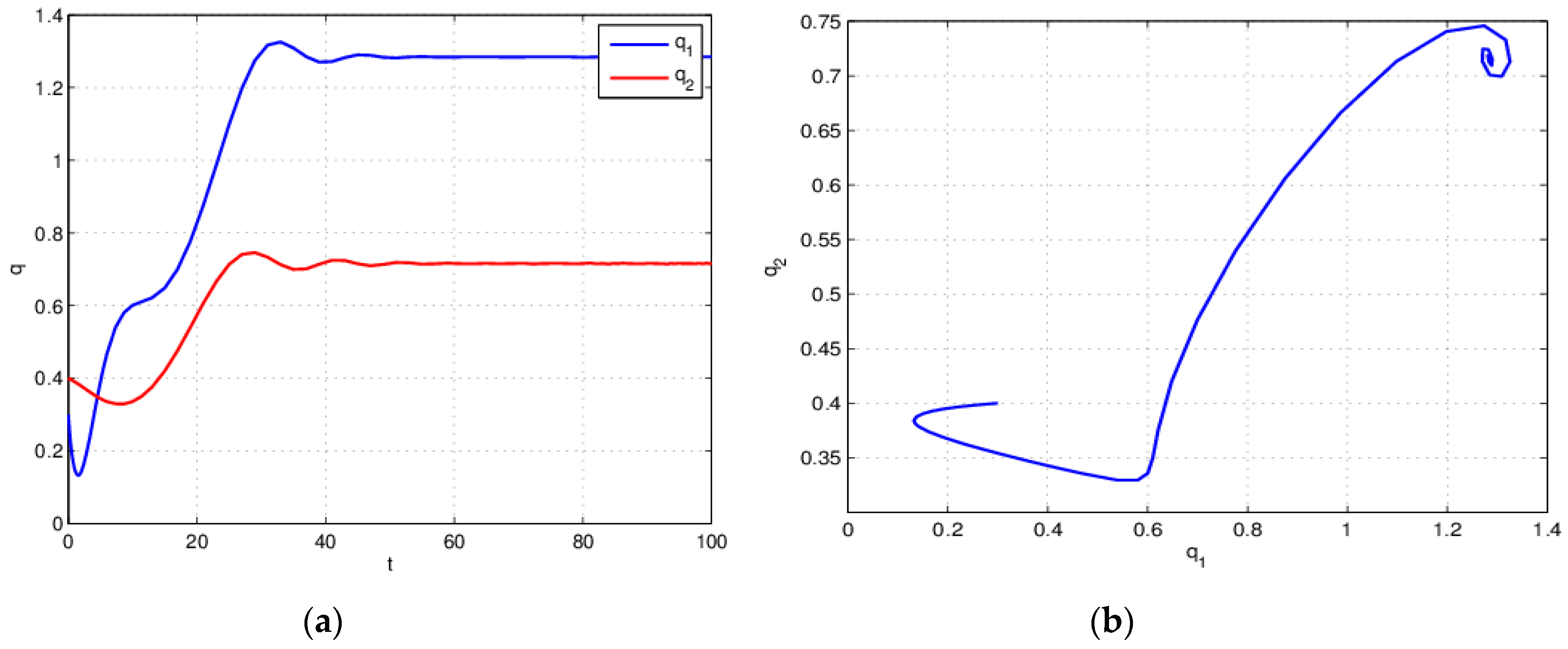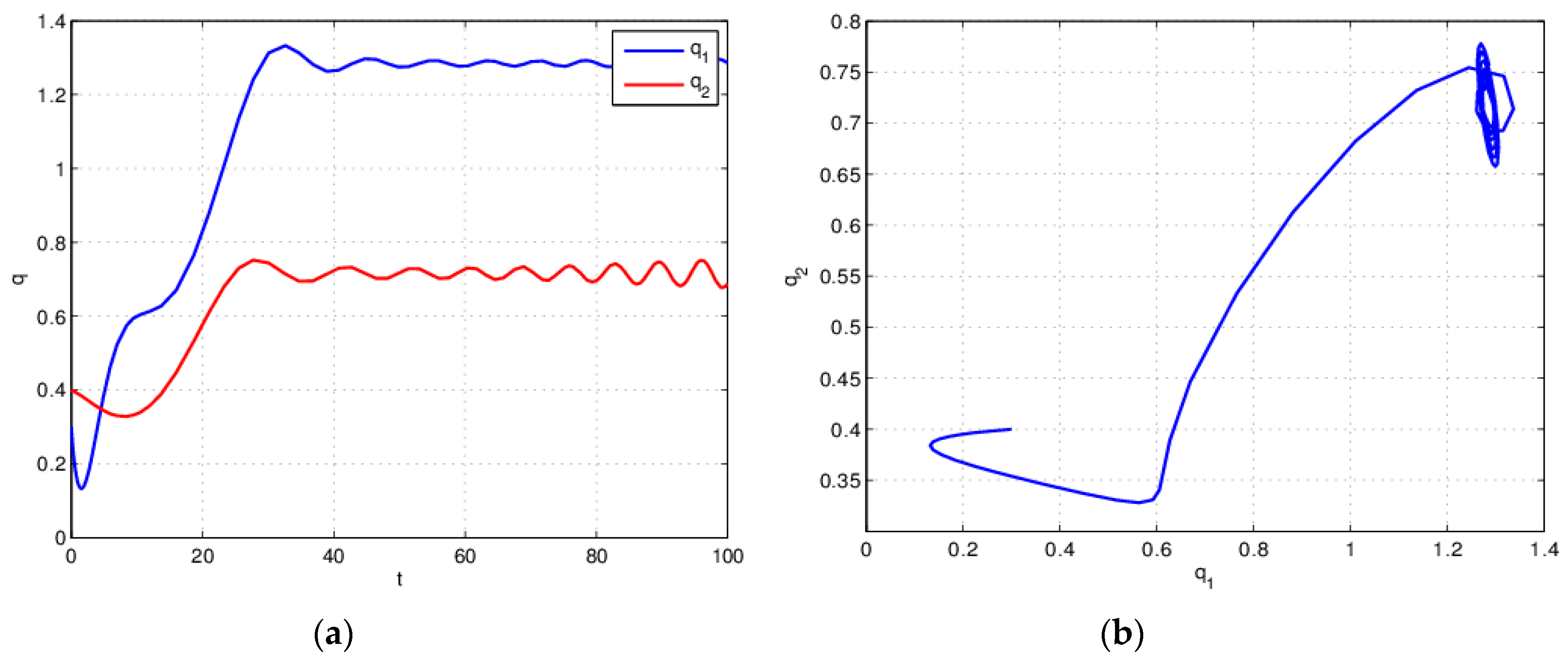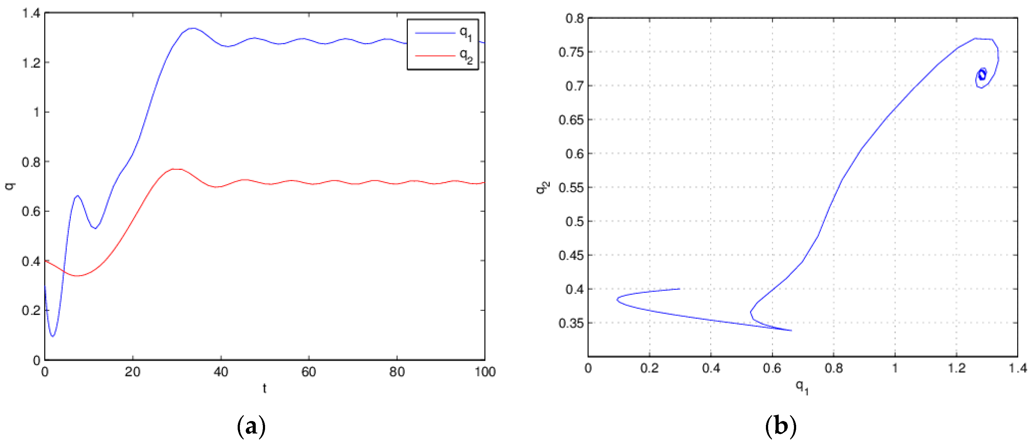 Equation (26) is stable when for . (a) Time series plot; (b) attractor.
