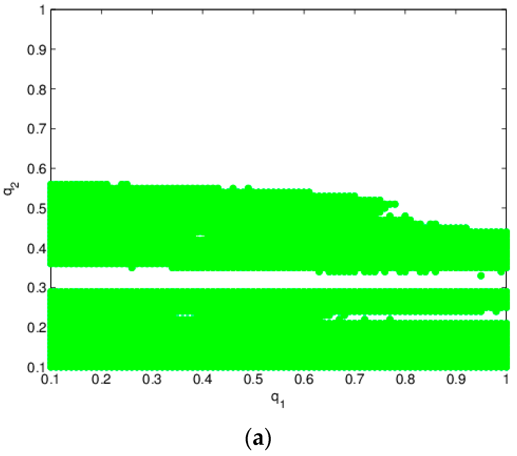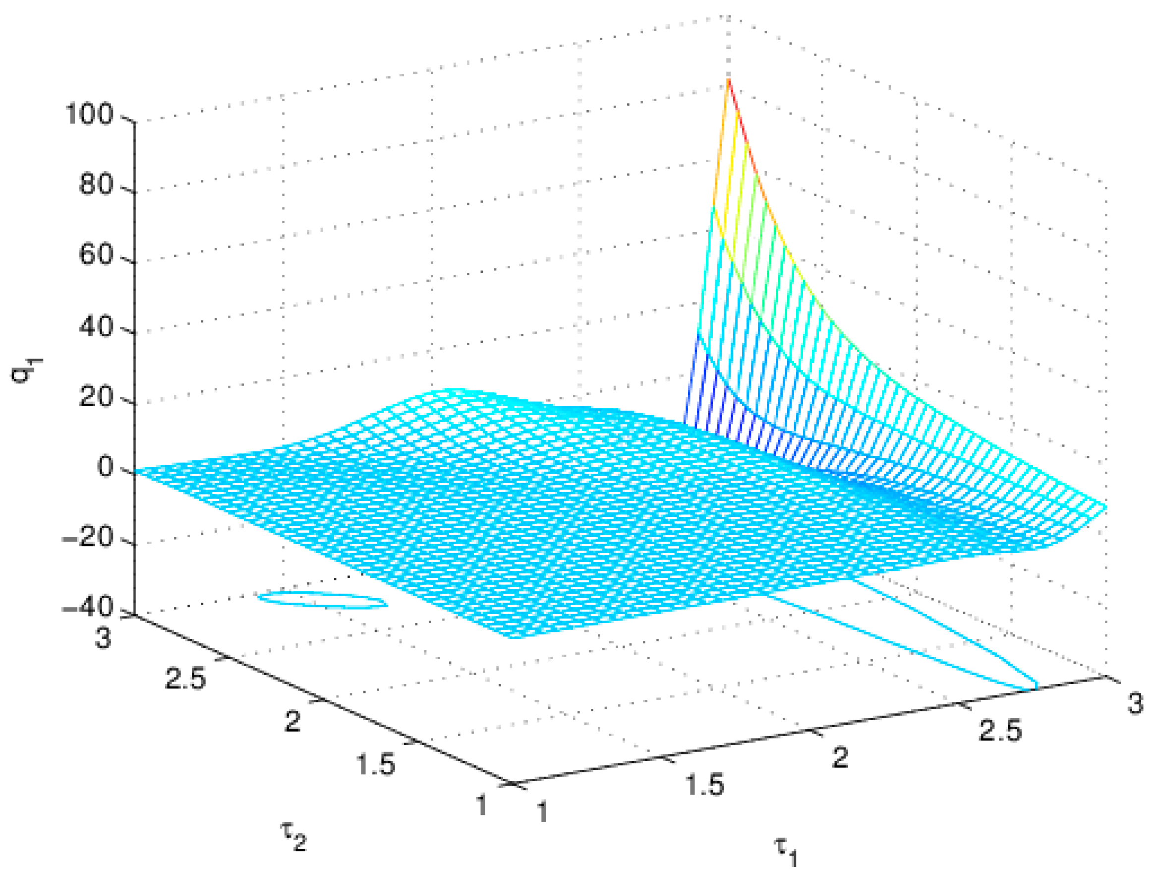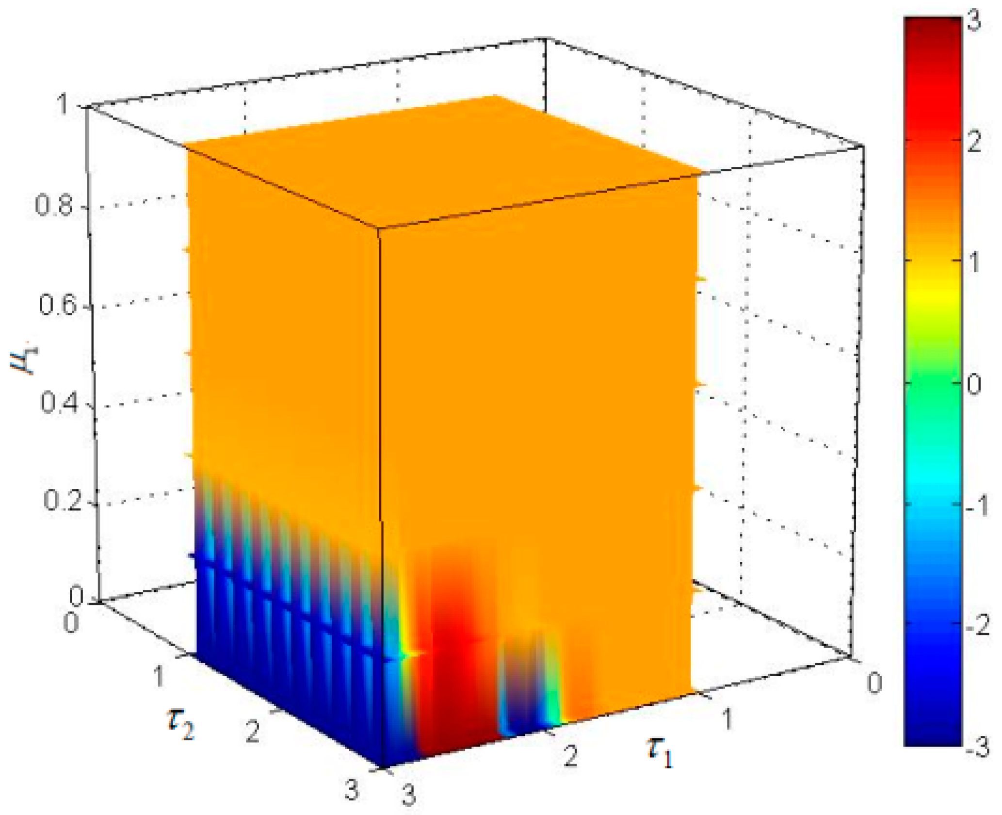 In this part, we study the effects of and on the stability of the system. Let and . This ensures that a combination of and appears bifurcation in the region of plane. From Figure 9 we see that with an increase of and , the system gradually loses its stability and enters a chaotic state. When the system is in a state of chaos (the blue region in Figure 10), the maximum value of is 82.15 for ; the minimum value of is −34.93 for . When the system is in a stable state (the green region in Figure 10), the value of is basically stable at 1.284. Therefore, in order to maintain the stability of the system, it is necessary to keep and in the green region of Figure 10.